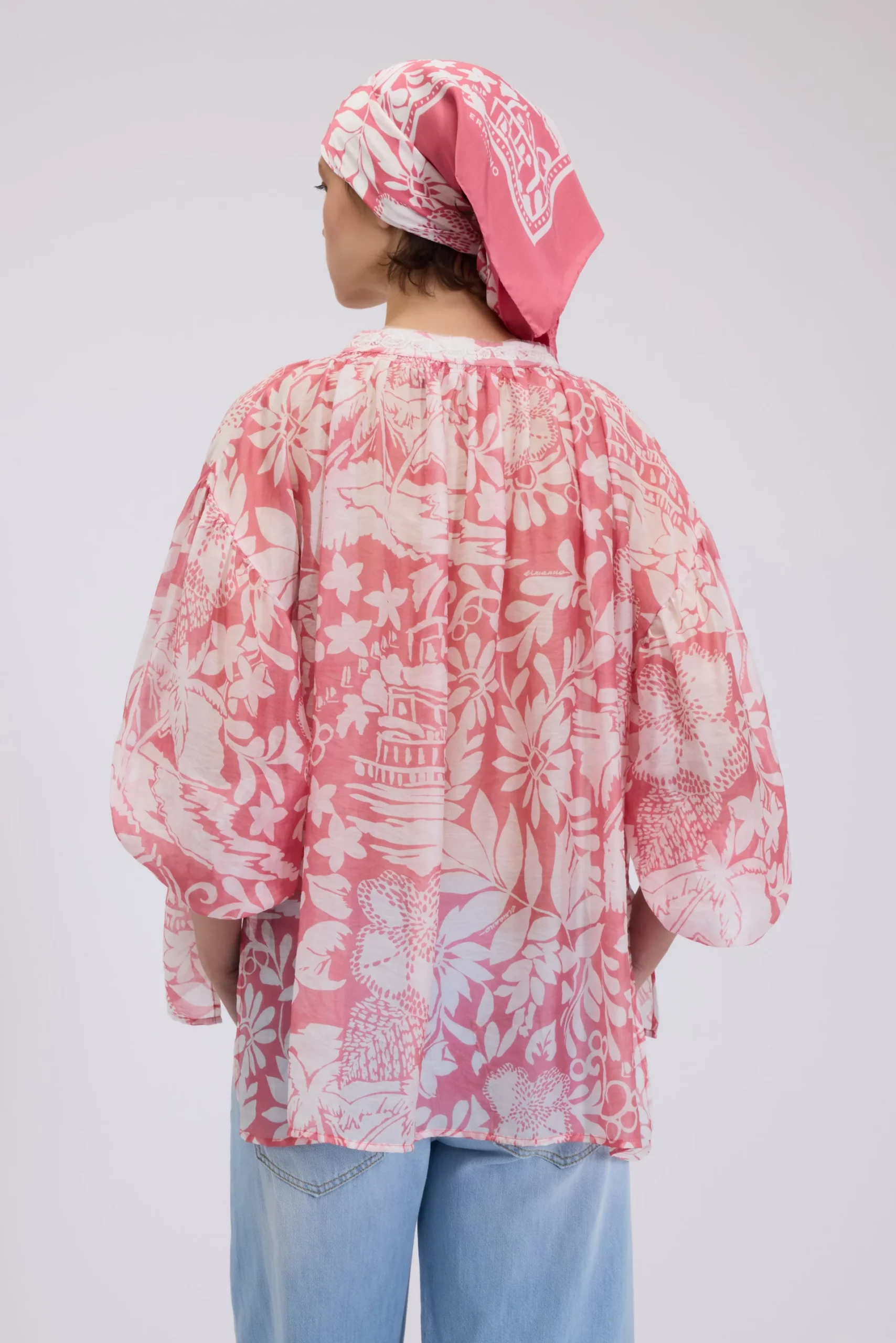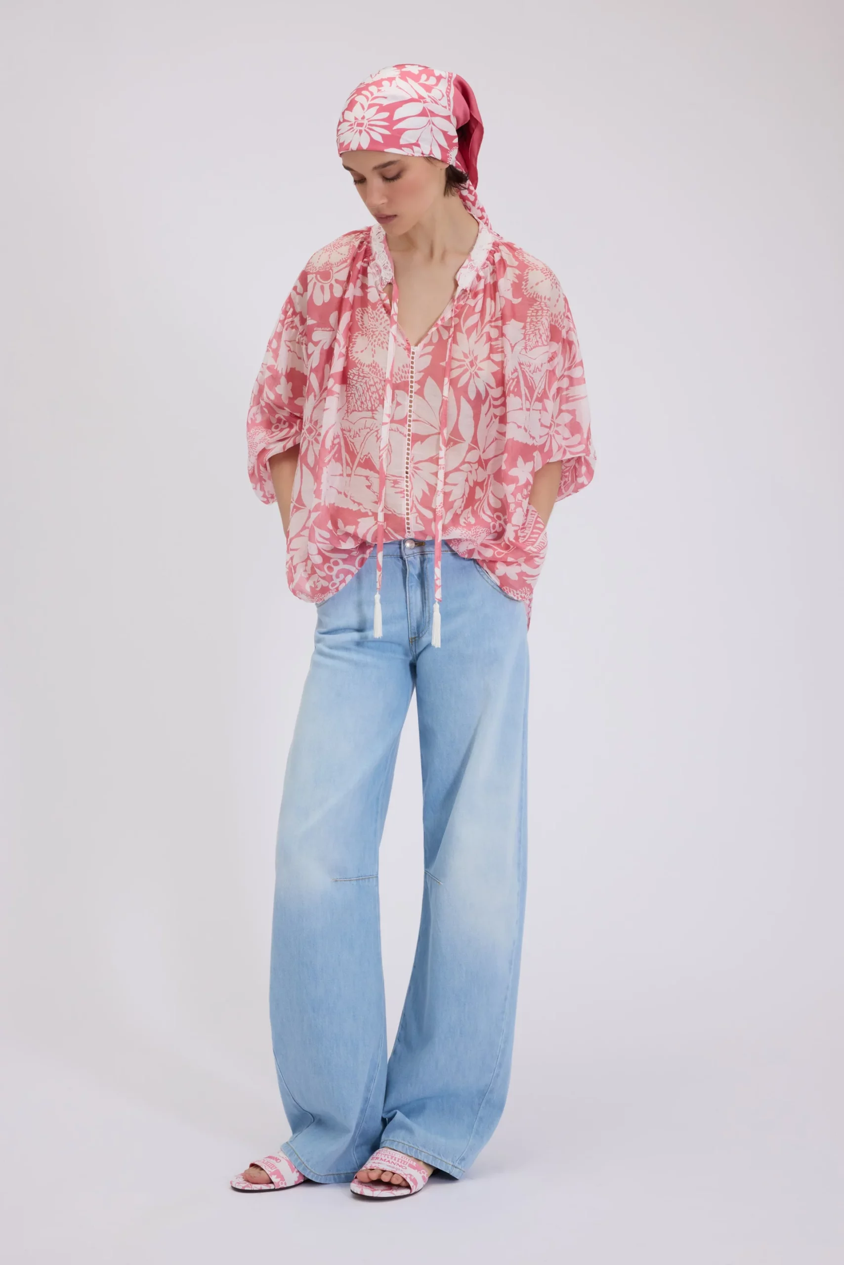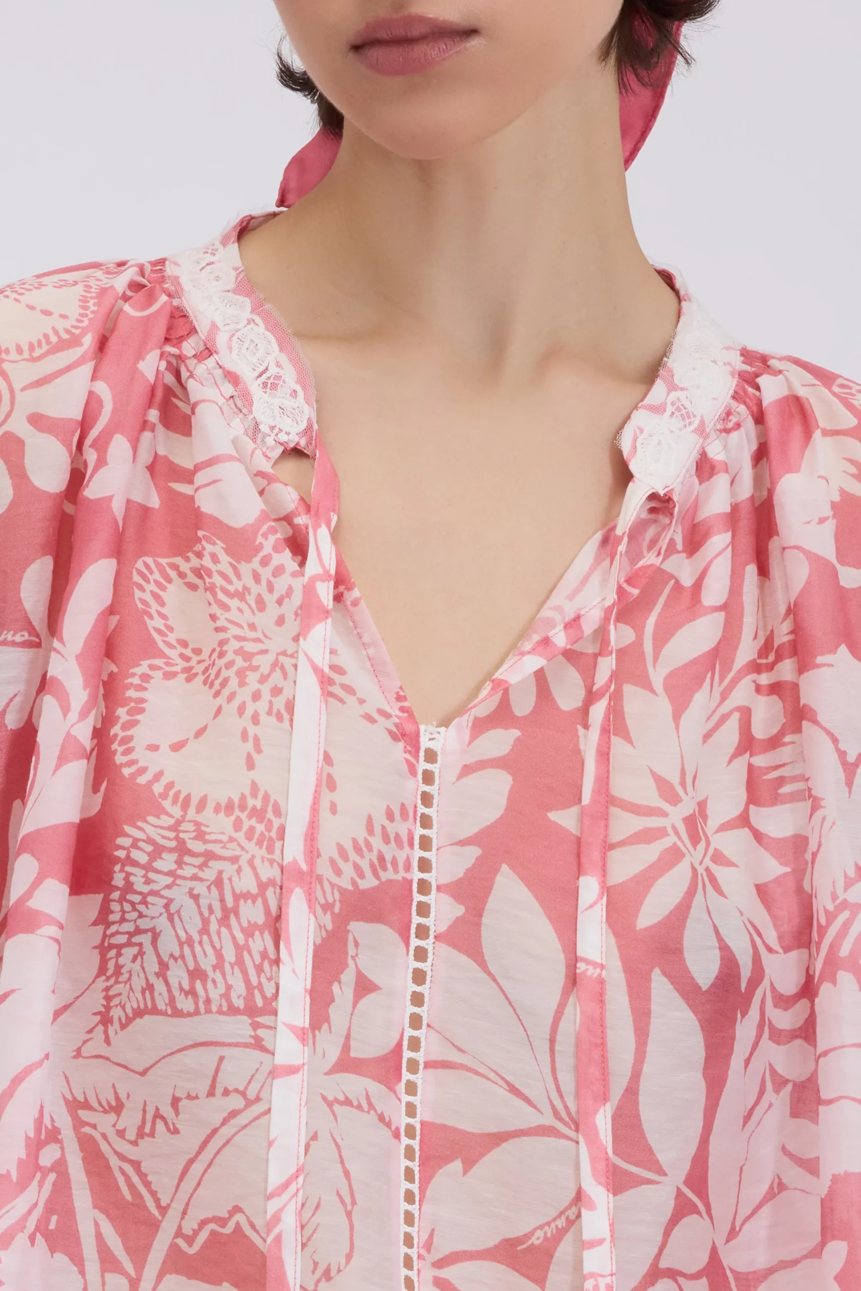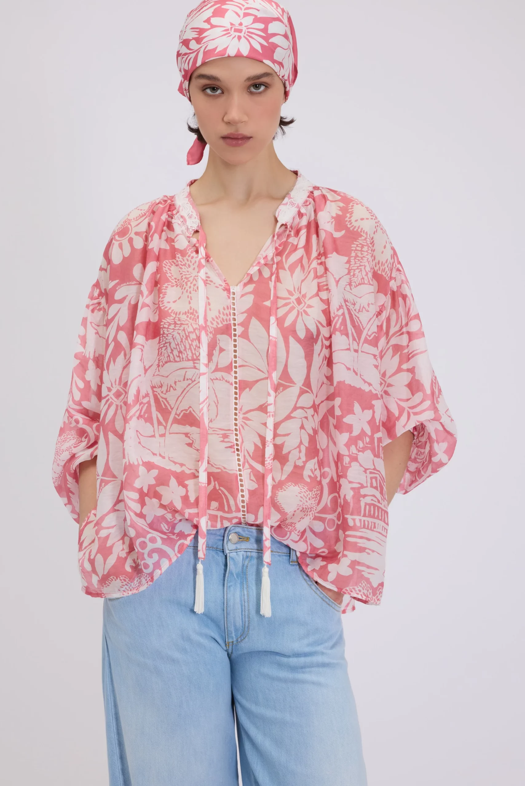Blouse en fine mousseline de coton légèrement transparente avec imprimé floral tropical all over signée Ermanno Firenze. Volume souple, manches raglan amples froncées par élastique. Col mao avec dentelle et ruban à pompons. Broderie ajourée au centre.