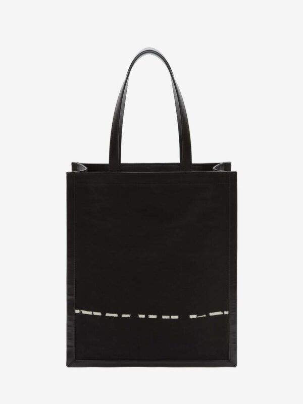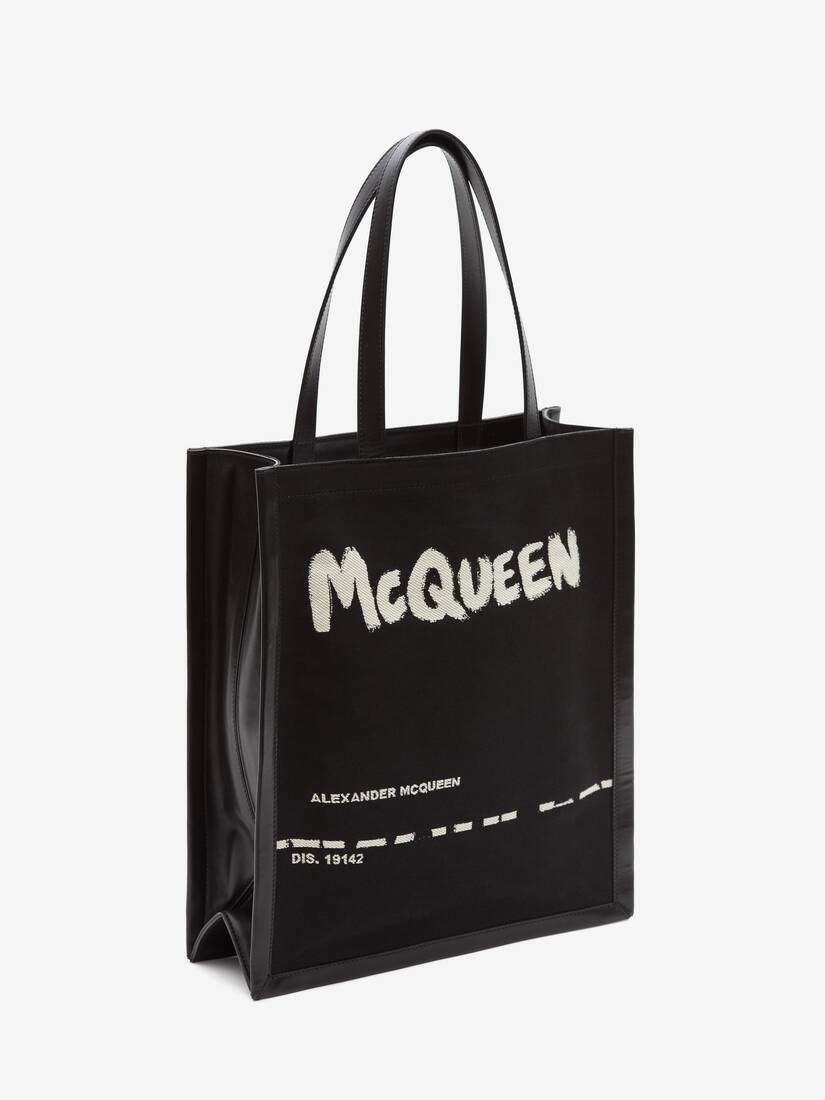 Cabas noir en jacquard imprimé avec signature McQueen imprimée façon graffiti. Ce sac peut se porter soit à l’épaule, soit à la main grâce à ses anses sur le dessus.