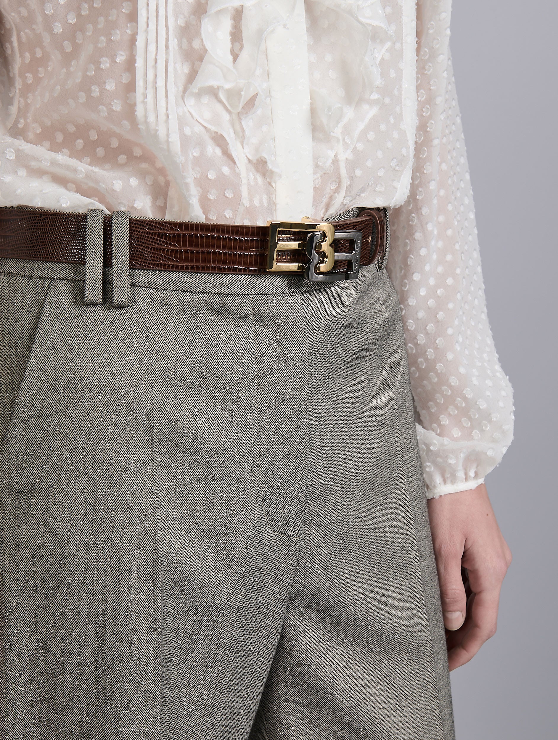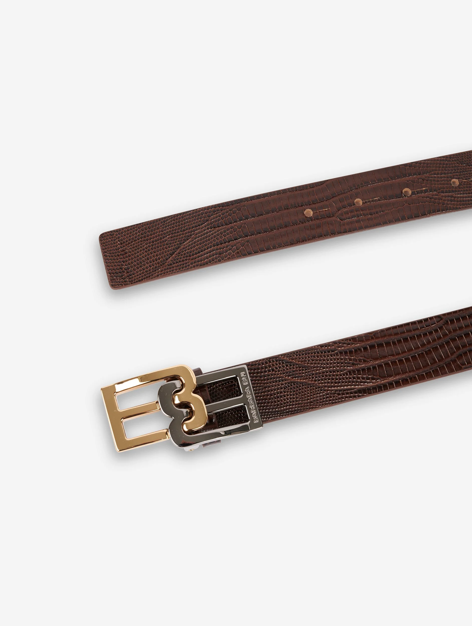 Ceinture en cuir marron façon lézard. Nouvelle boucle logo siglée Barbara Bui, finition bicolore dorée et argentée. Réglage 5 trous.