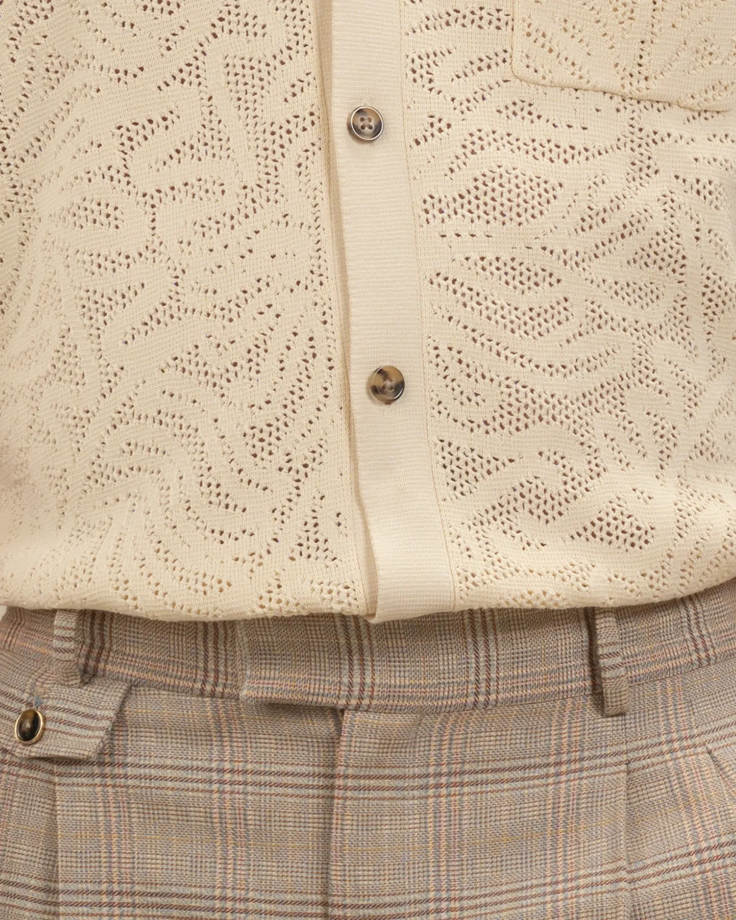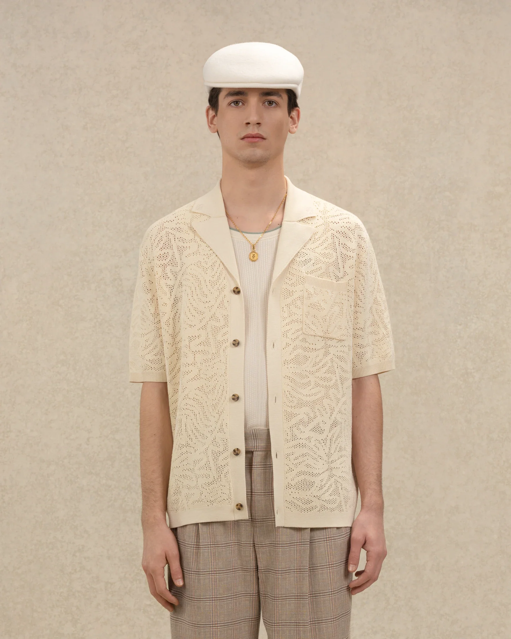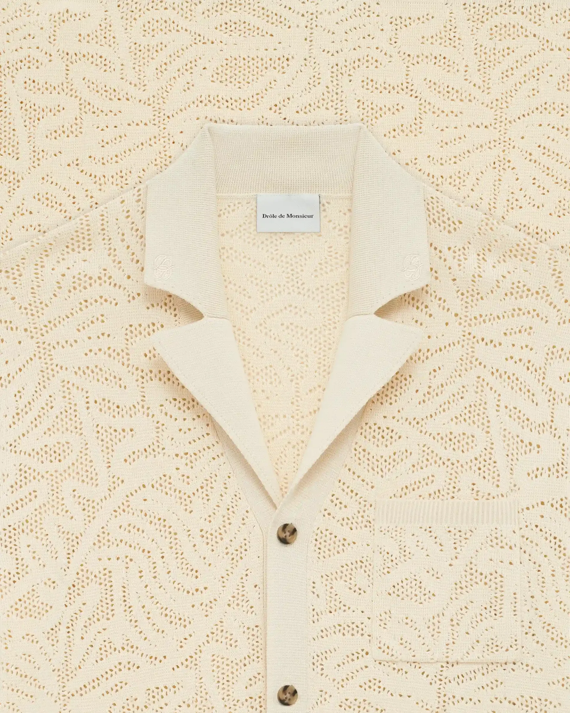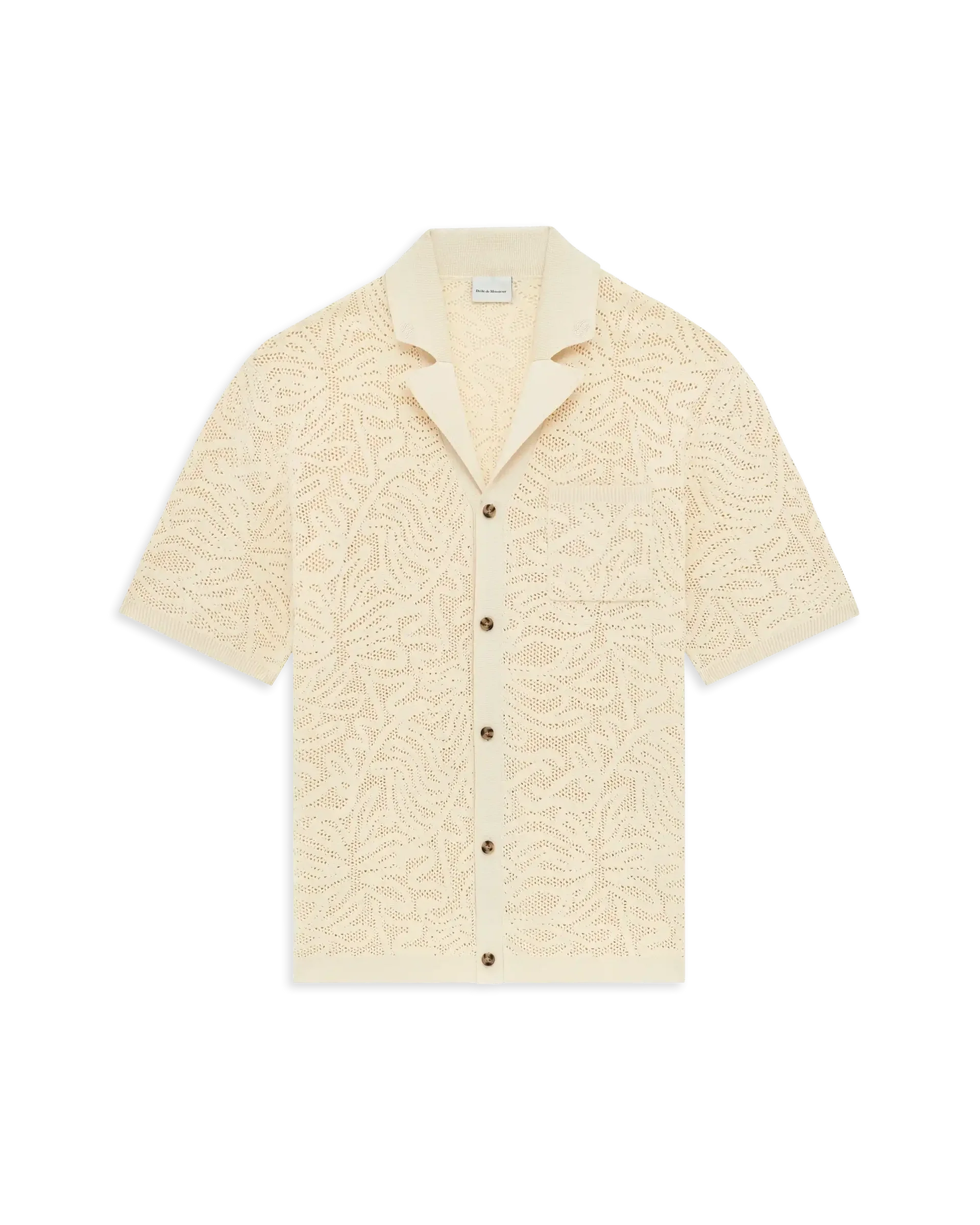 Cette chemise beige signée Drôle de Monsieur, à manches courtes en maille effet dentelle a un col ouvert, un boutonnage simple à cinq boutons et une poche plaquée.