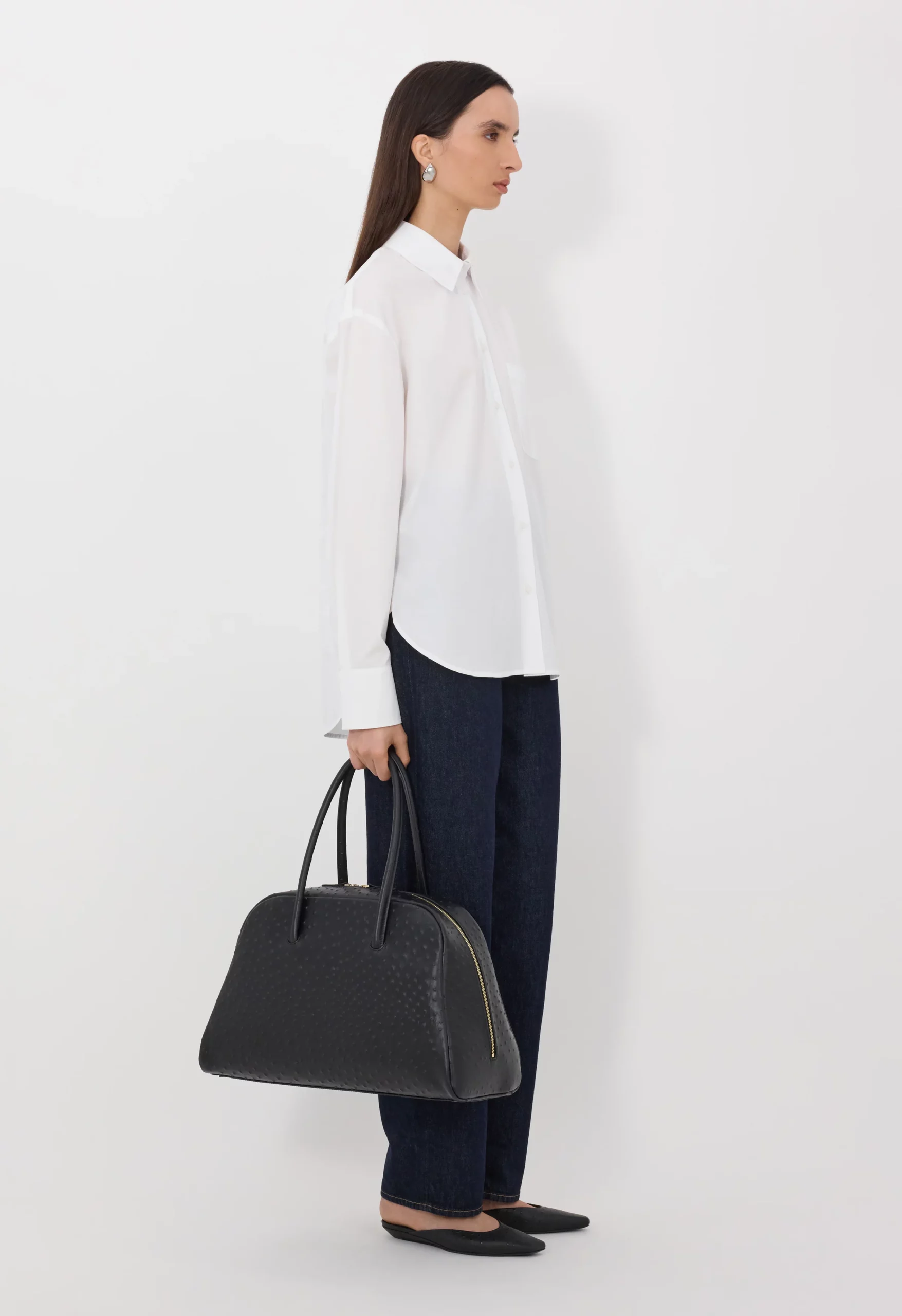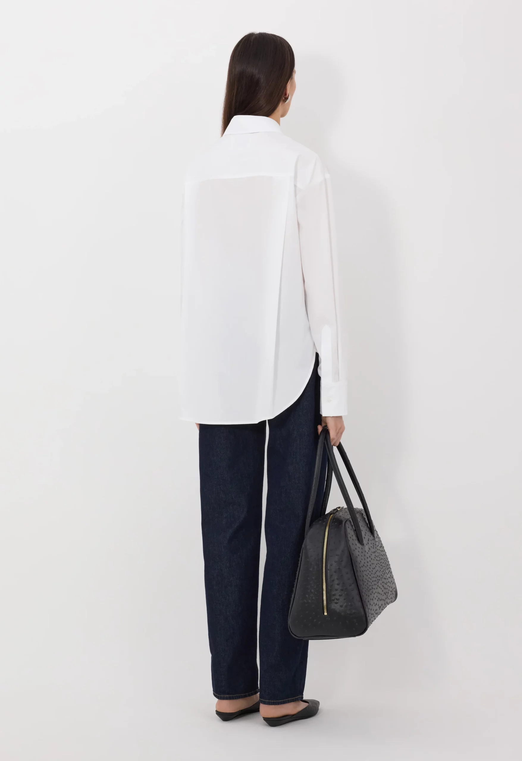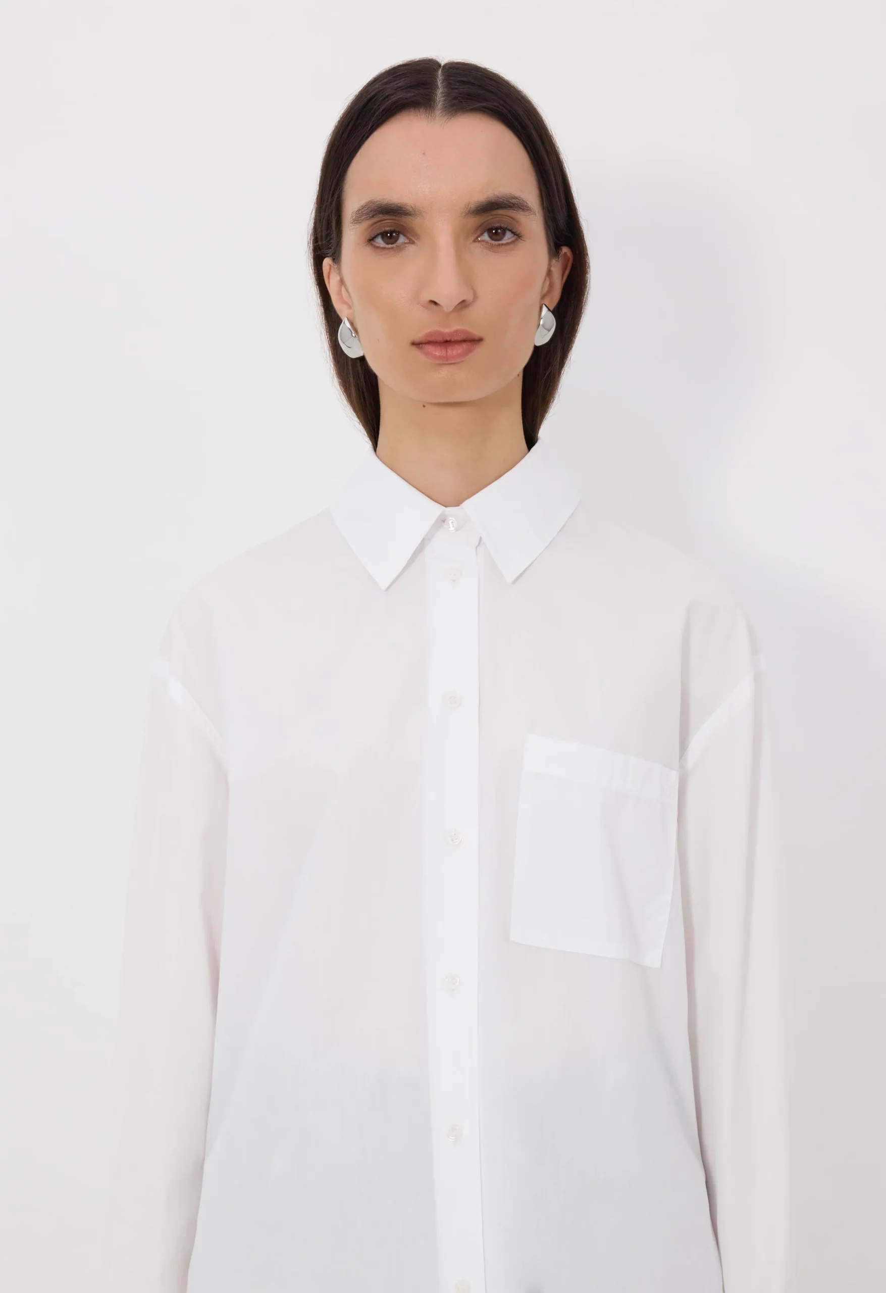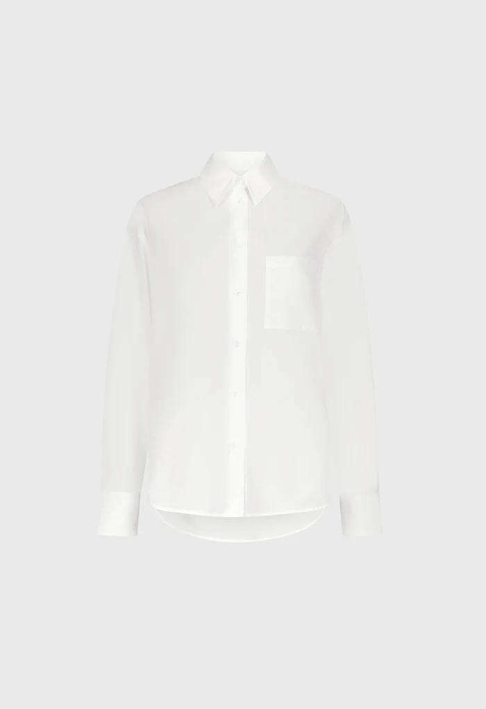 Cette chemise by Loulou de Saison est réalisée en popeline de coton blanc à la main craquante. Elle présente une coupe oversize avec un col italien, un empiècement dos, des poignets boutonnés et un ourlet légèrement arrondi, faisant d’elle une pièce intemporelle.