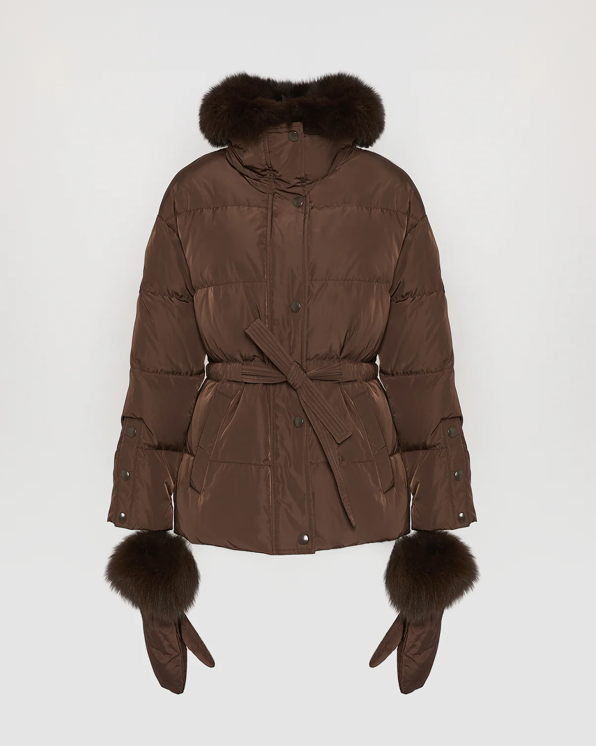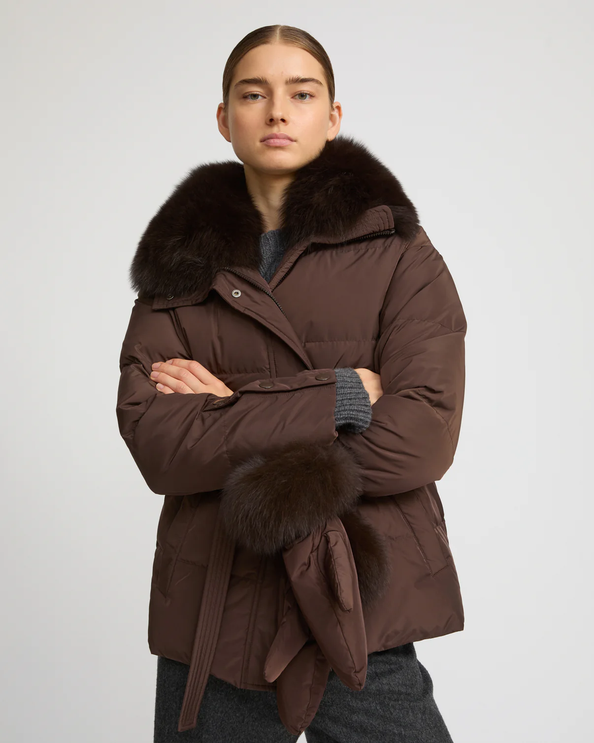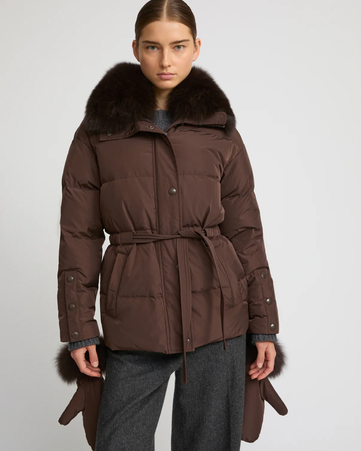 Une silhouette élégante et une protection à toute épreuve avec cette doudoune Yves Salomon aux nombreux détails bien pensés. Sa forme ceinturée souligne le corps, tandis qu’un col amovible en renard réchauffe le visage. Des moufles assorties avec leur bordure renard peuvent se porter reliées à la veste.