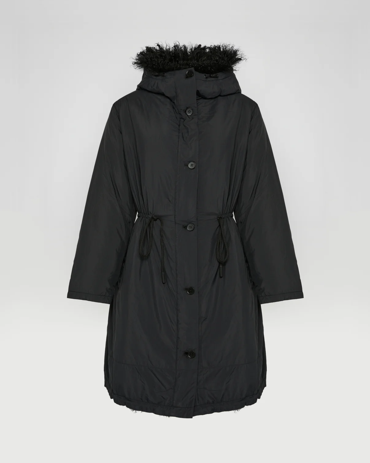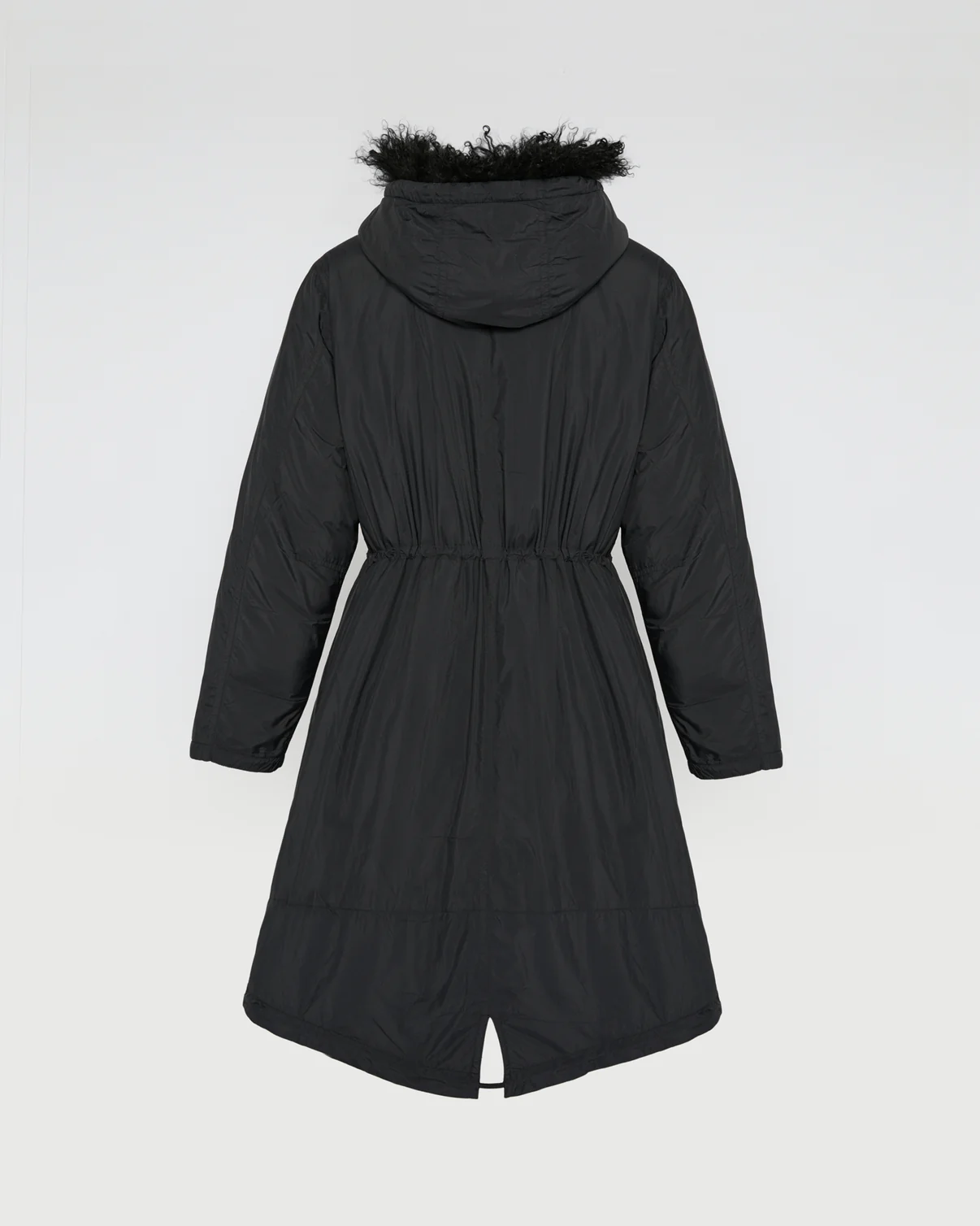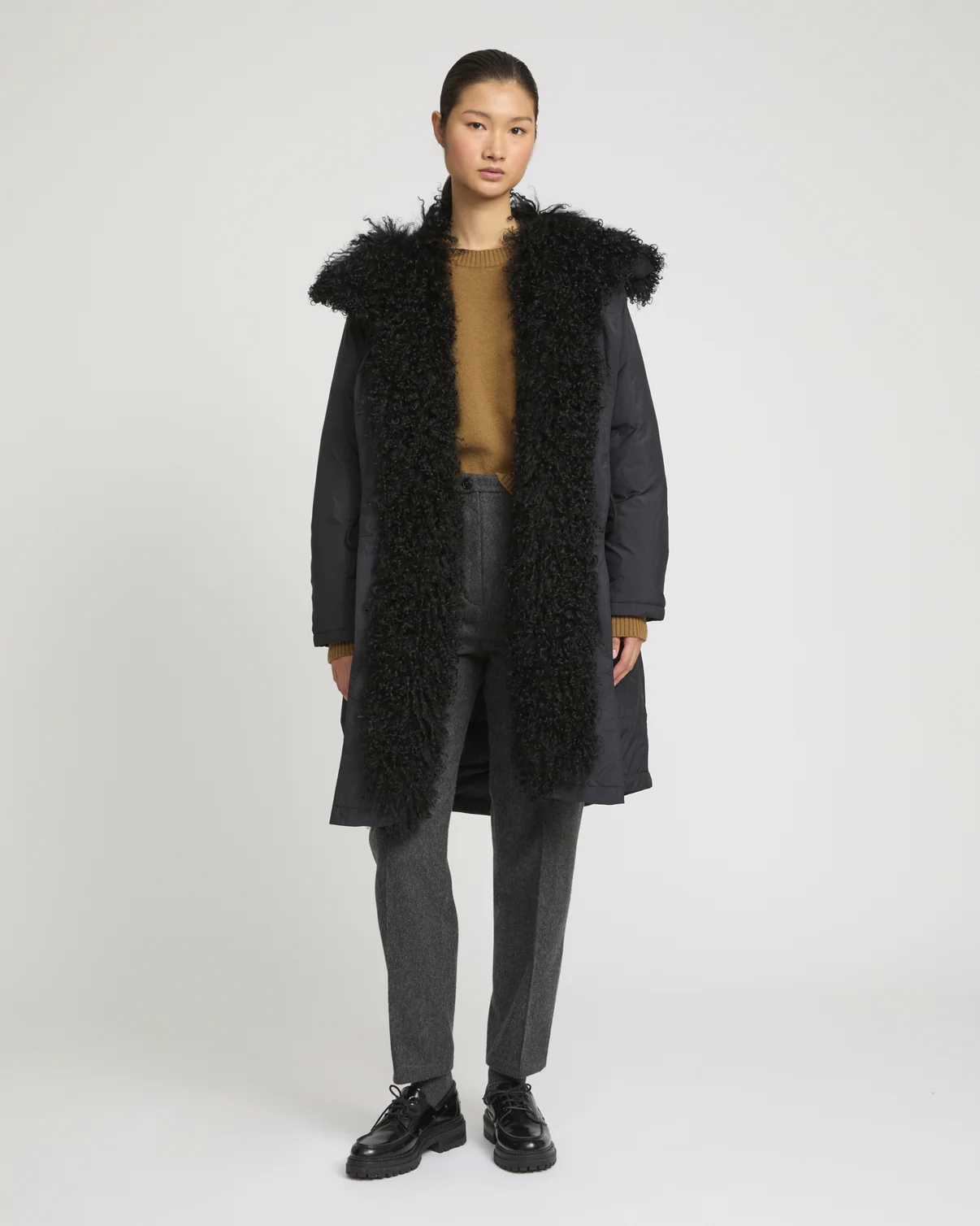 • Devant et intérieur de capuche garni agneau long poil frisé galonné