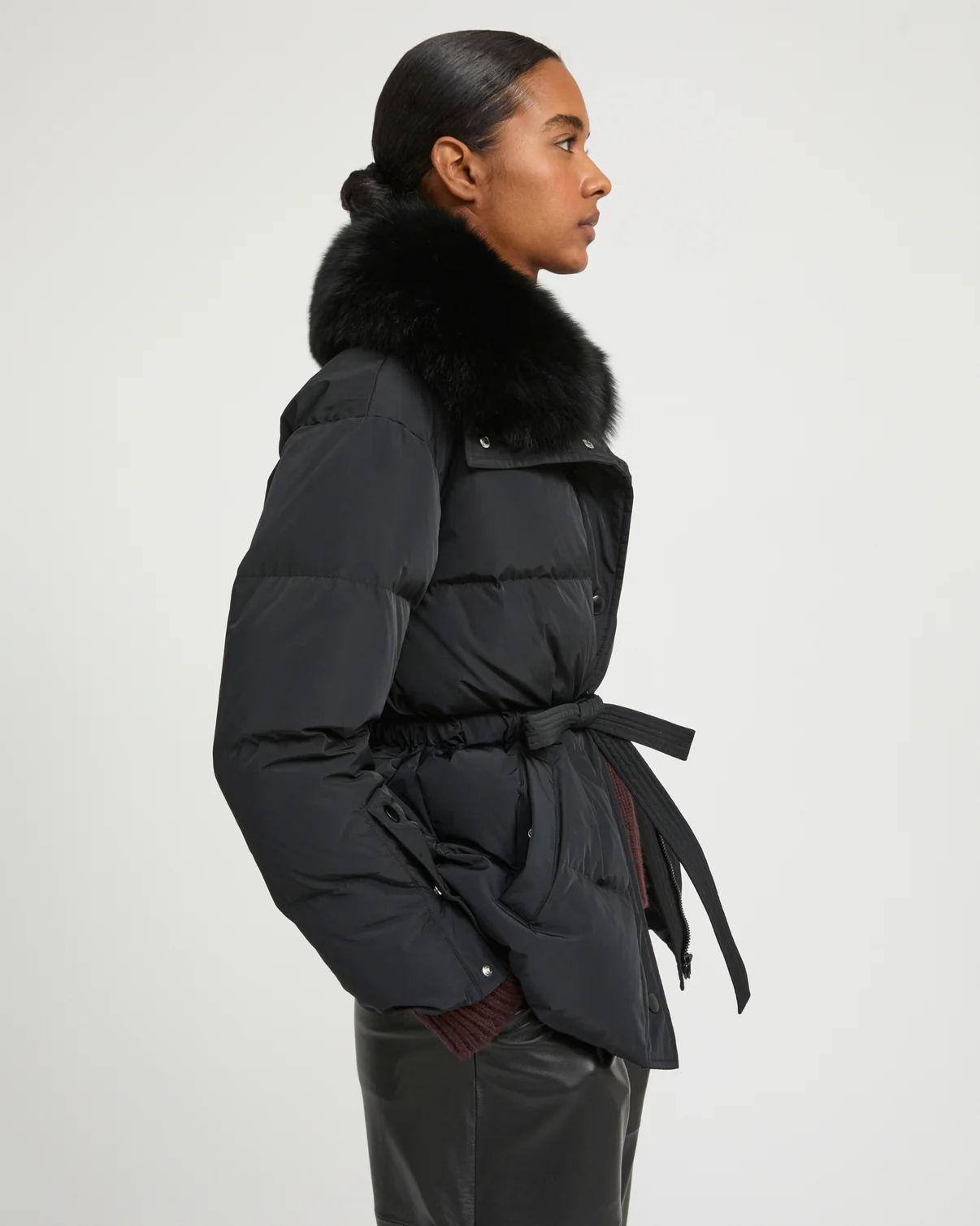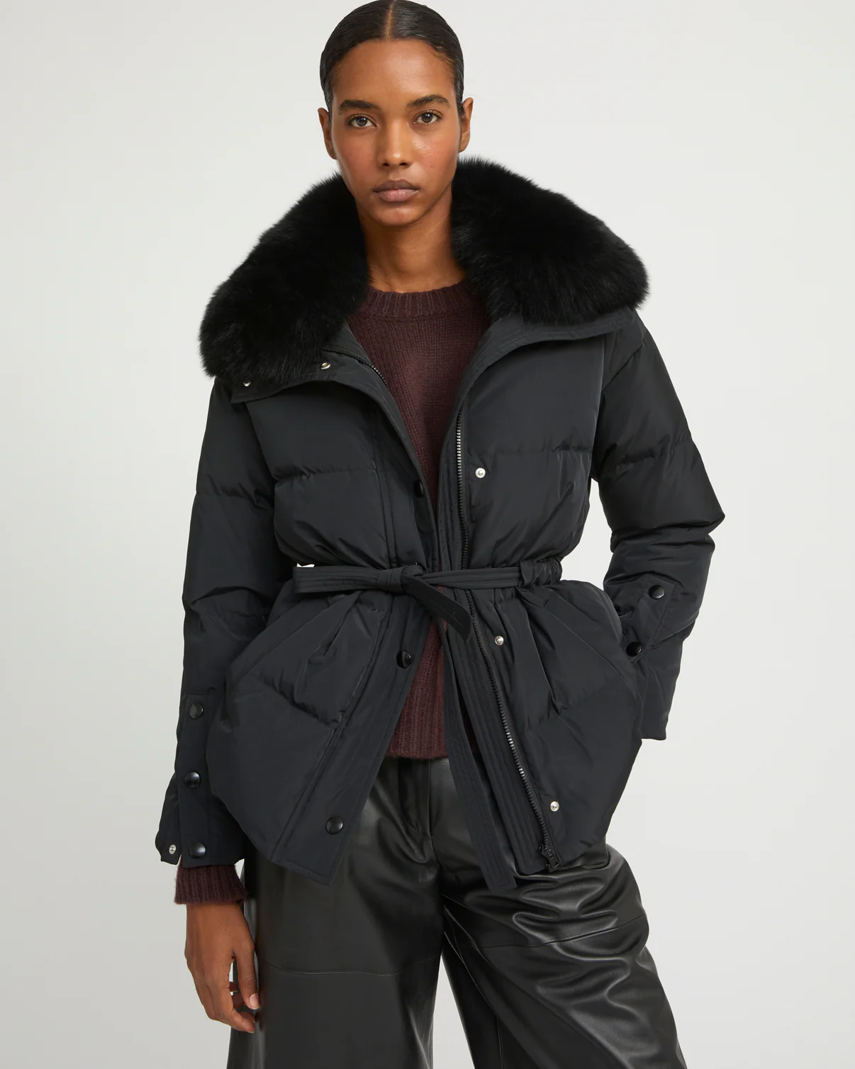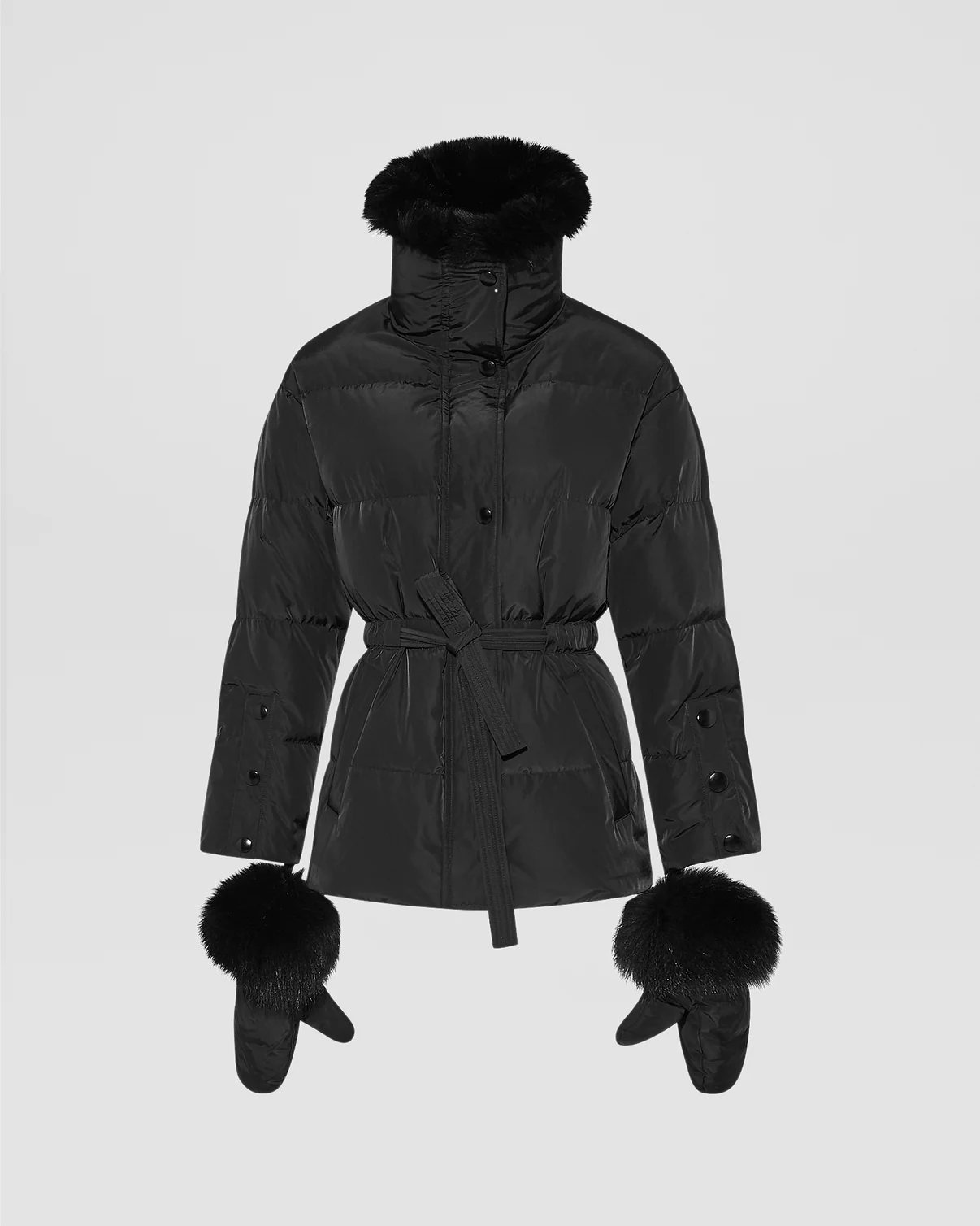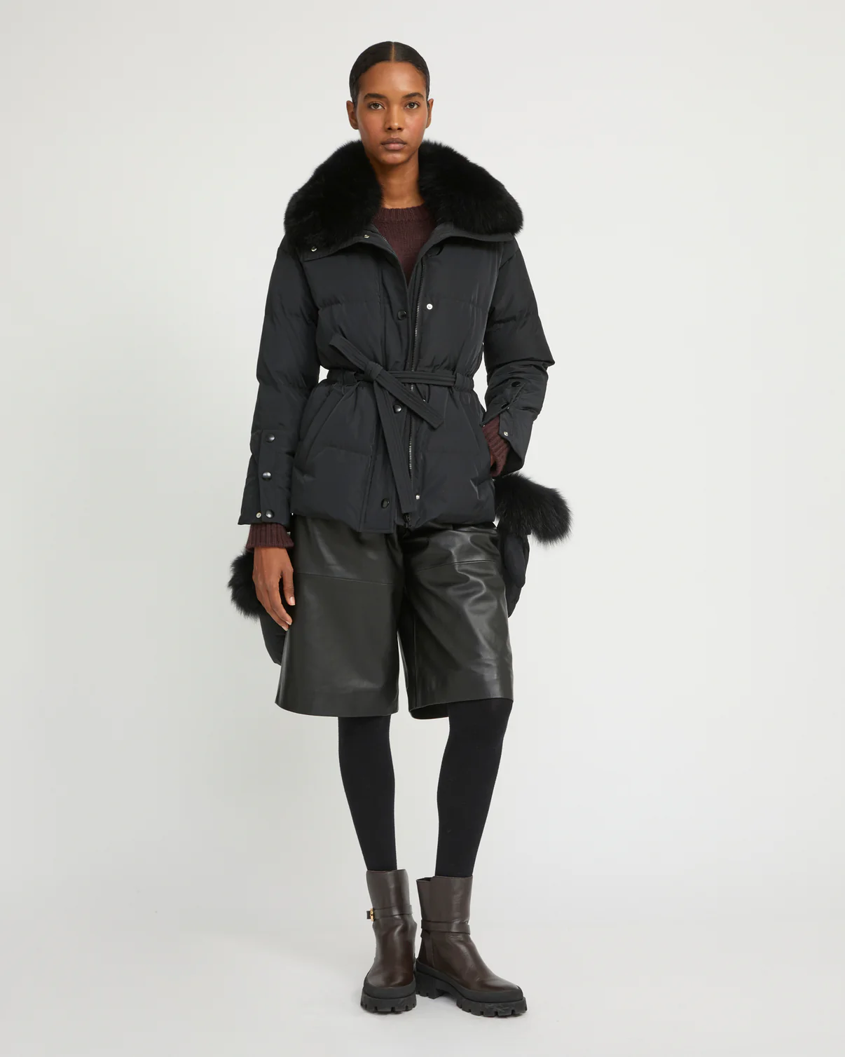 Une silhouette élégante et une protection à toute épreuve avec cette doudoune Yves Salomon aux nombreux détails bien pensés. Sa forme ceinturée souligne le corps, tandis qu’un col amovible en renard réchauffe le visage. Des moufles assorties avec leur bordure renard peuvent se porter reliées à la veste.