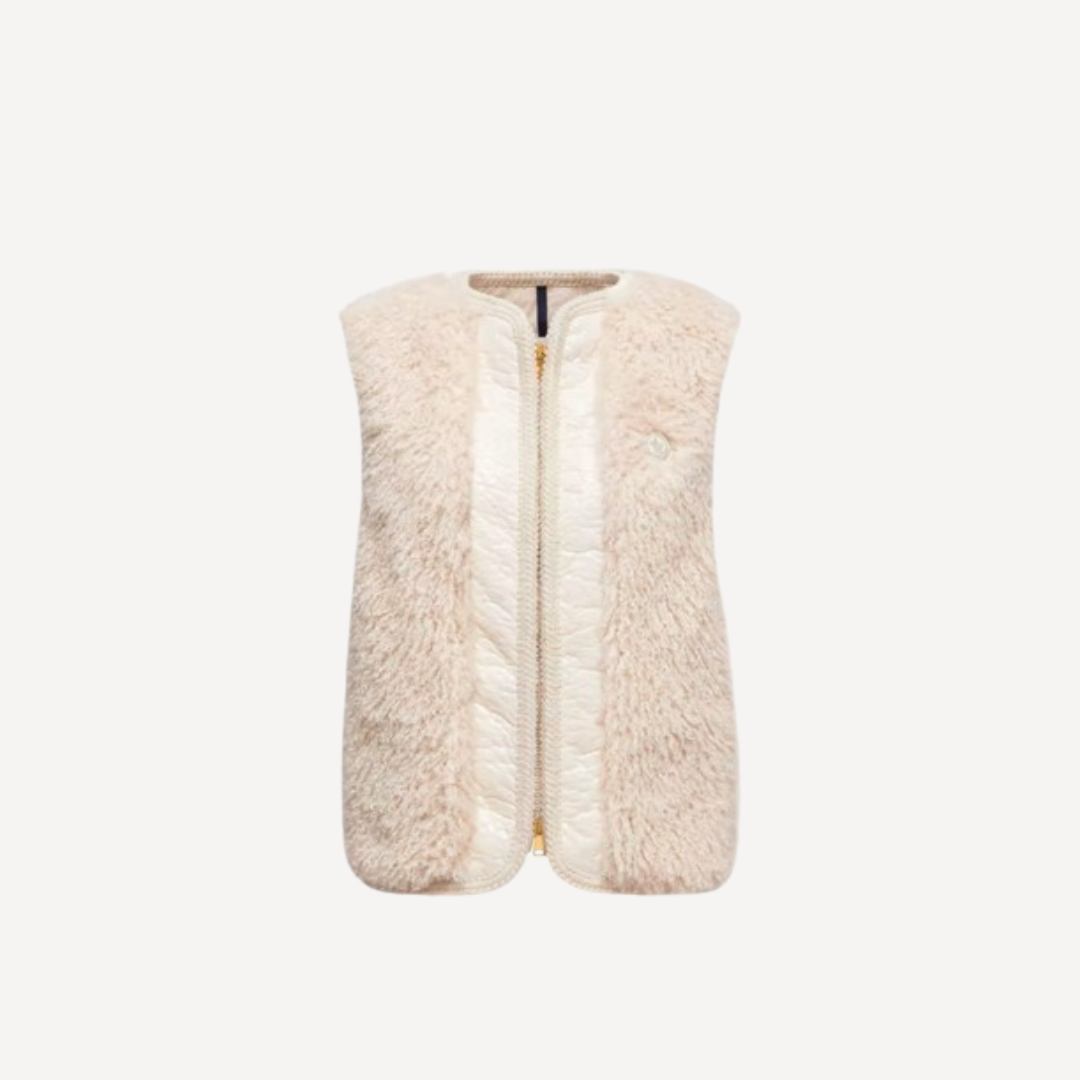 Idéale pour affronter la saison froide, la veste sans manches Tournel Moncler matelassée en teddy pour femme se distingue par ses textures et sa finition tactile.