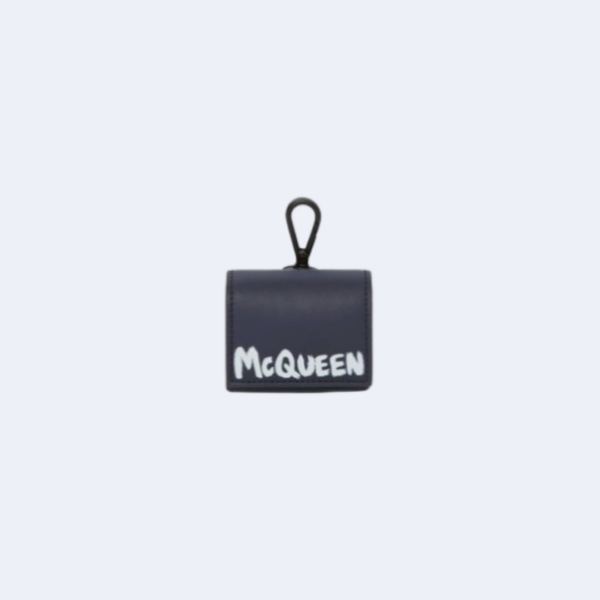 Étui pour AirPod Pro en cuir de veau bleu marine orné de l’imprimé signature graffiti McQueen. Ce modèle est doté d’un fermoir permettant de l’attacher à un sac.