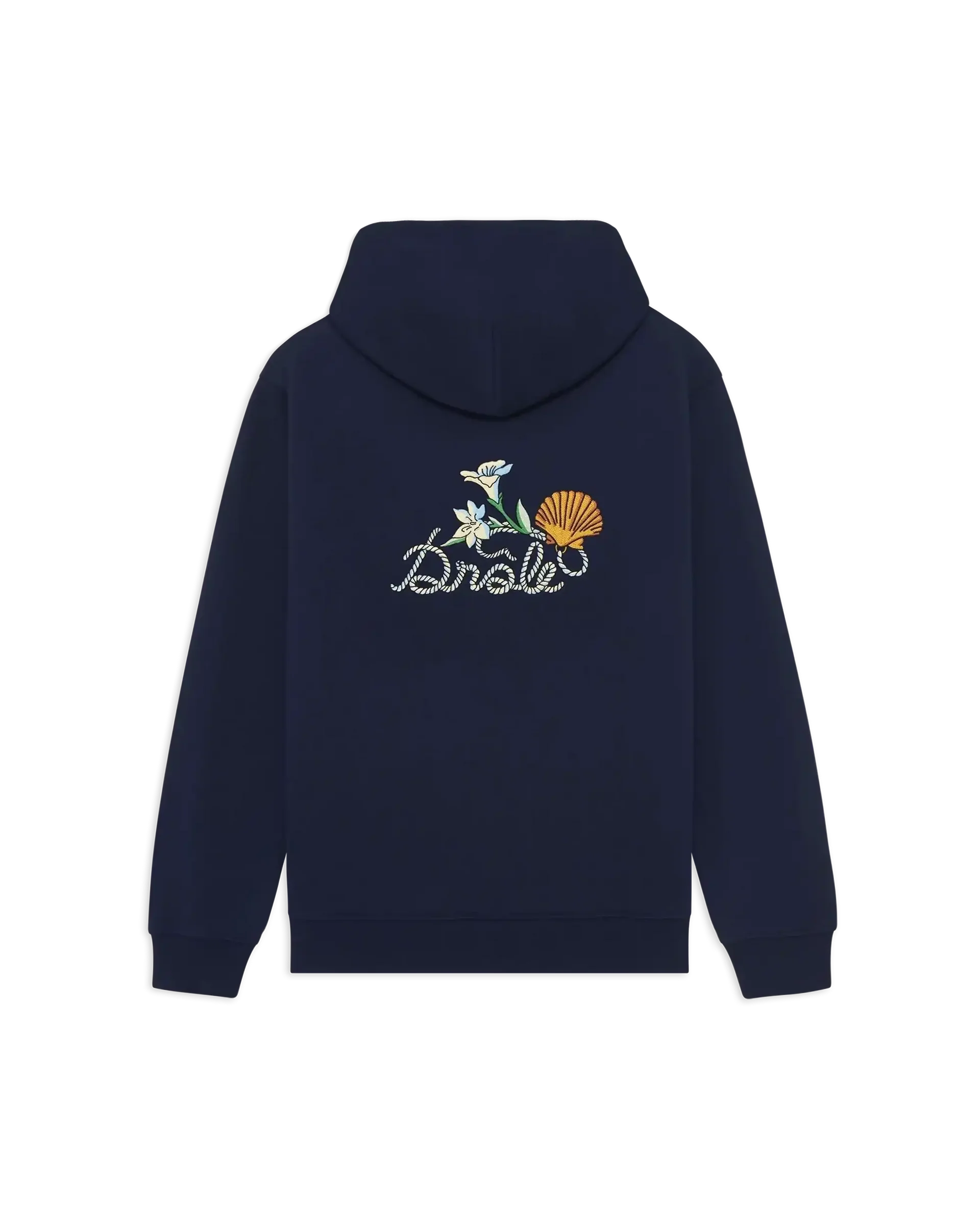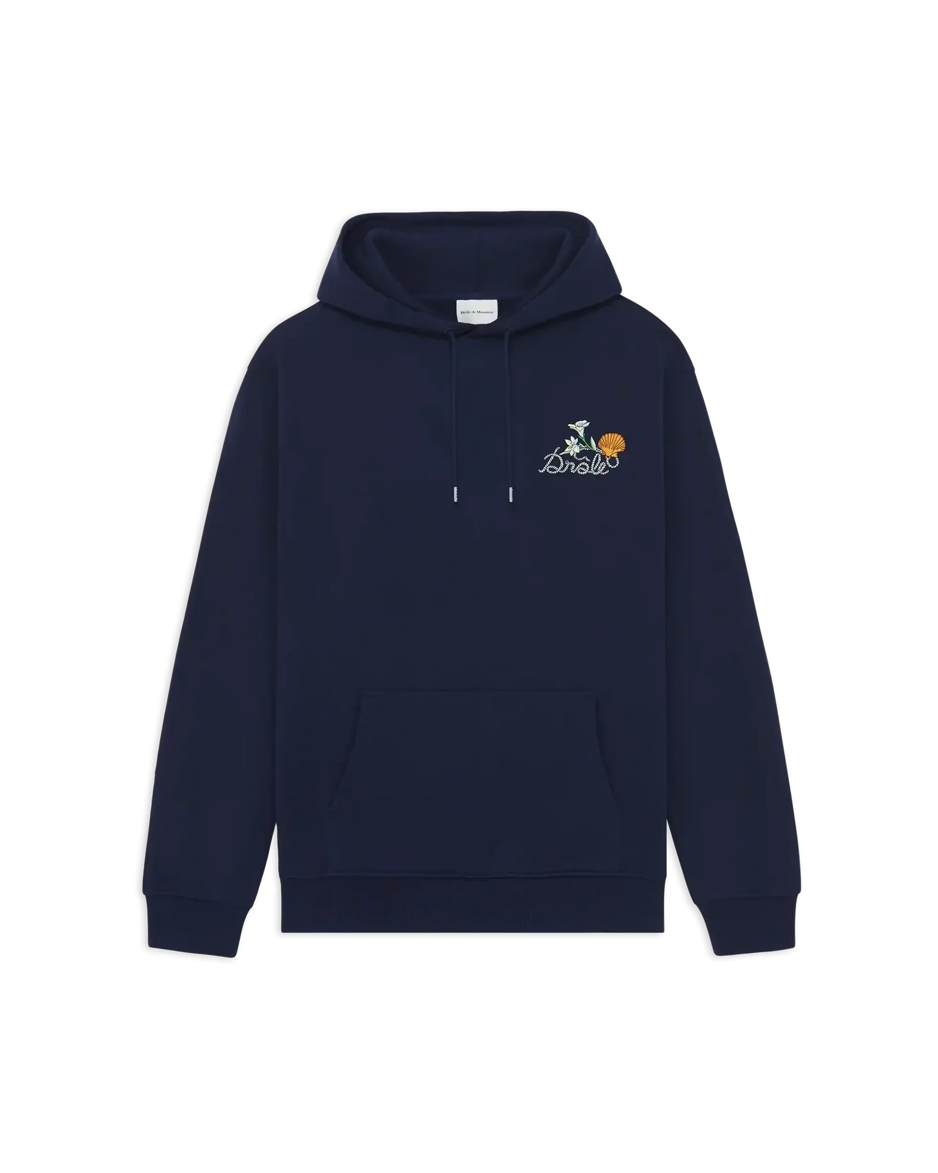 Ce hoodie bleu marine signé Drôle de Monsieur est orné d’une petite broderie « Drôle Coquillage » à l’avant et d’une grande broderie « Drôle Coquillage » au dos. Il a une capuche avec cordon de serrage ainsi que les poignets et bas de corps en bord-côtes.