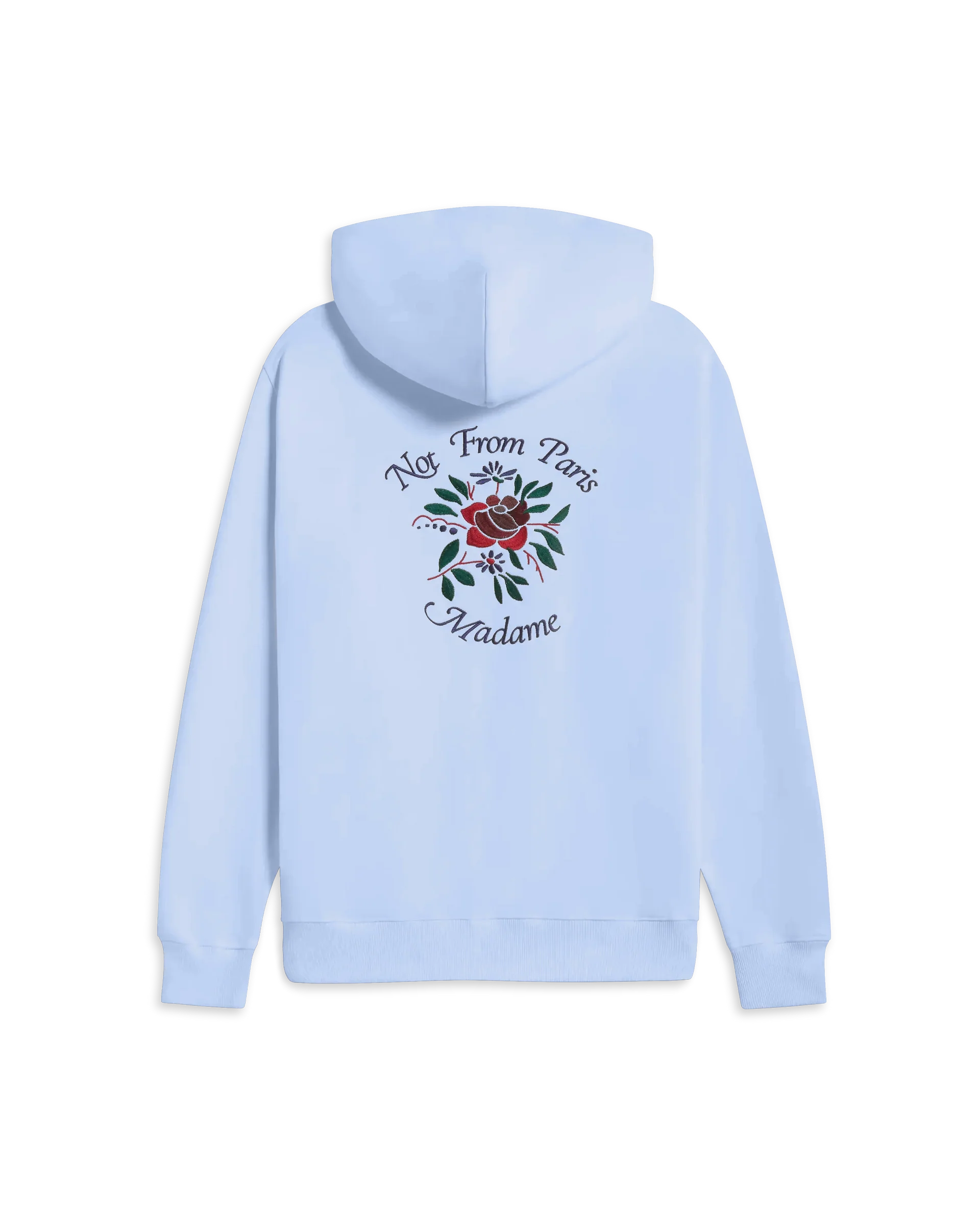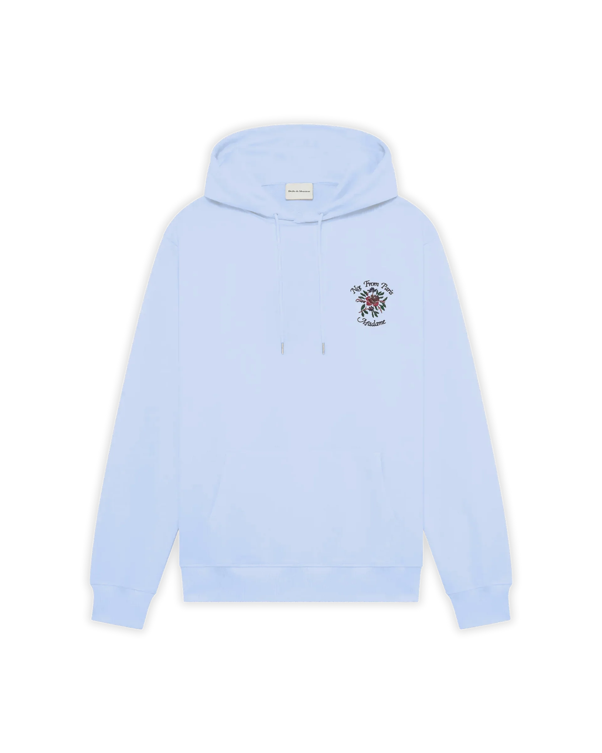 Ce sweat bleu clair signé Drôle de Monsieur, dispose d’une capuche à cordon de serrage avec pointes cirées, d’une poche kangourou et d’une broderie slogan bleu à l’avant et à l’arrière.