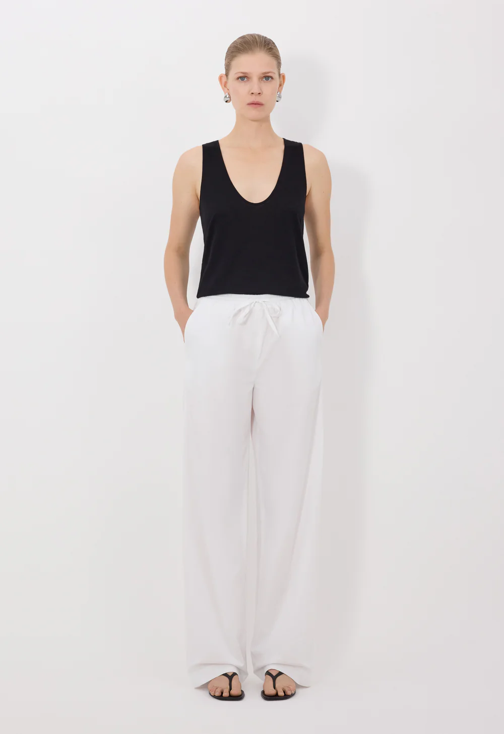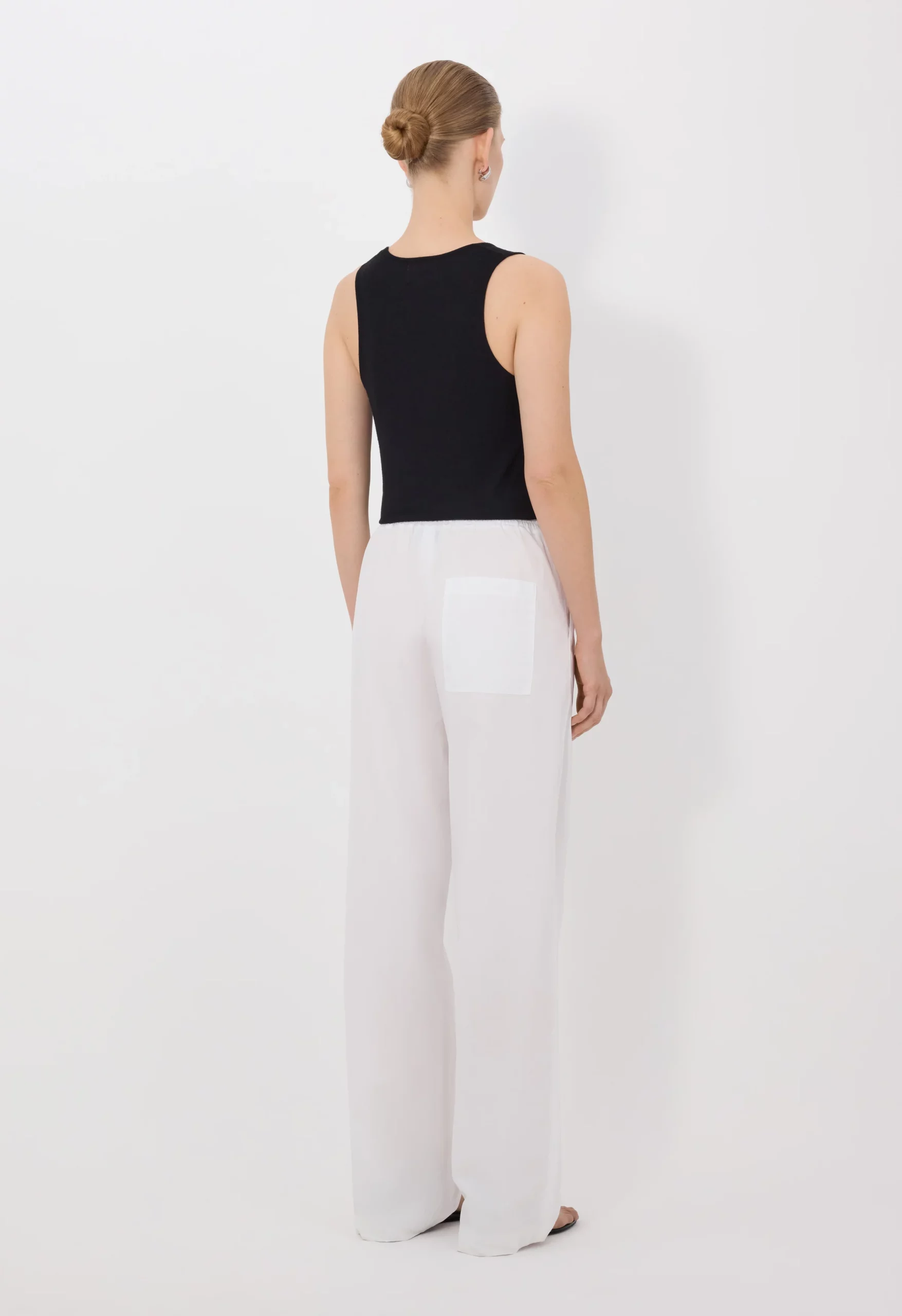 Ce pantalon blanc by Loulou de Saison est réalisé en popeline de coton. Sa coupe droite se complète d’une taille mi-haute élastique et de poches couture latérales, faisant de lui une pièce légère et facile à porter.