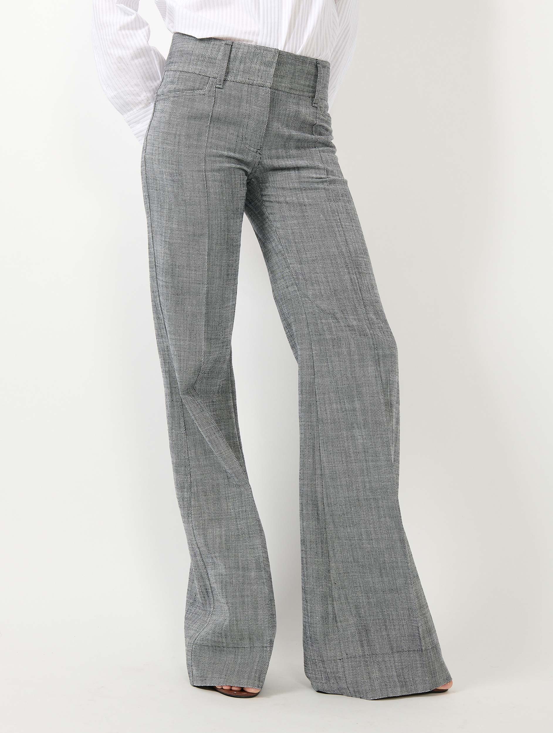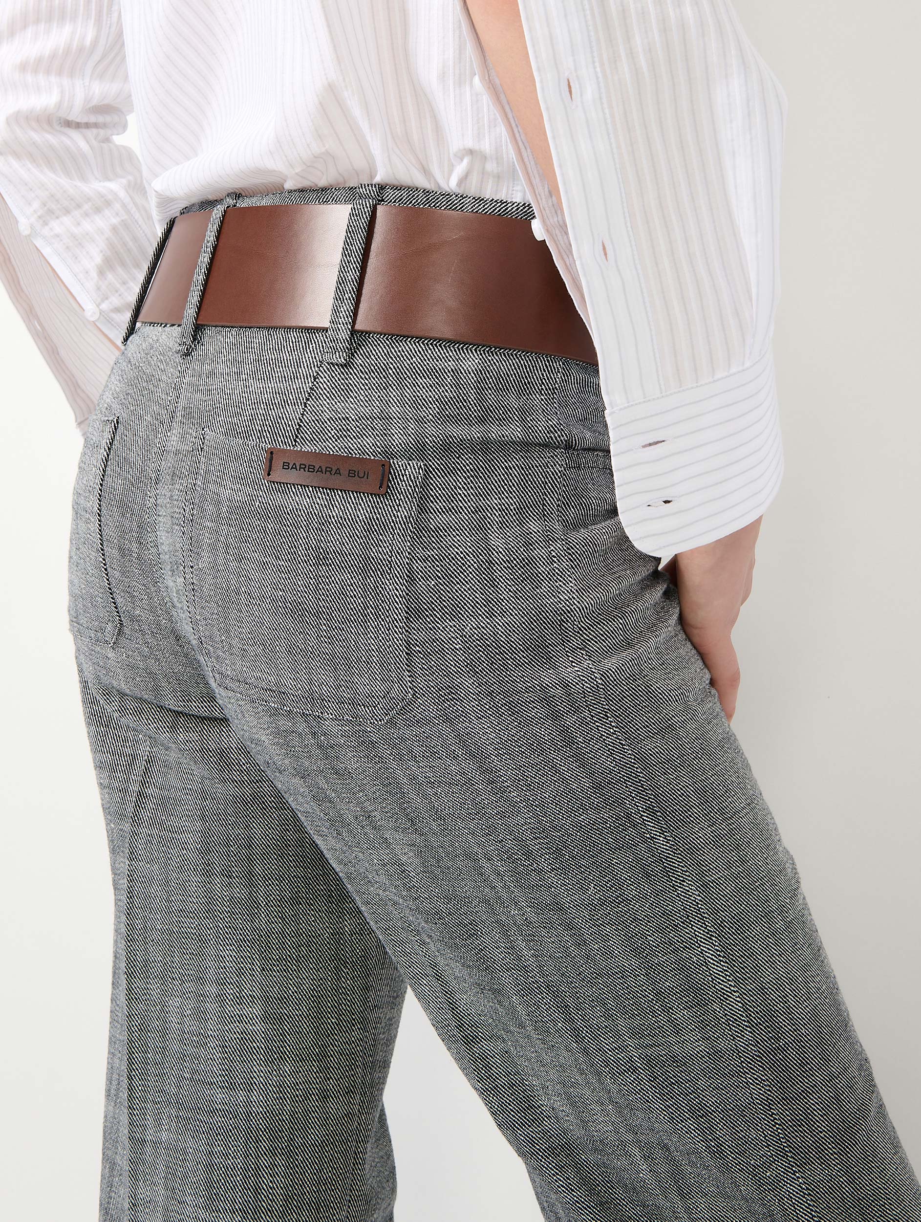 Radicale, la silhouette s’étire sublimée par ce pantalon by Barbara Bui, à la coupe flare réalisé dans un sergé de coton à l’effet texturé. En gris, ce modèle s’affirme comme la pièce forte d’une tenue associé à une chemise. Sa taille montée dispose de larges passants permettant d’y insérer une ceinture.