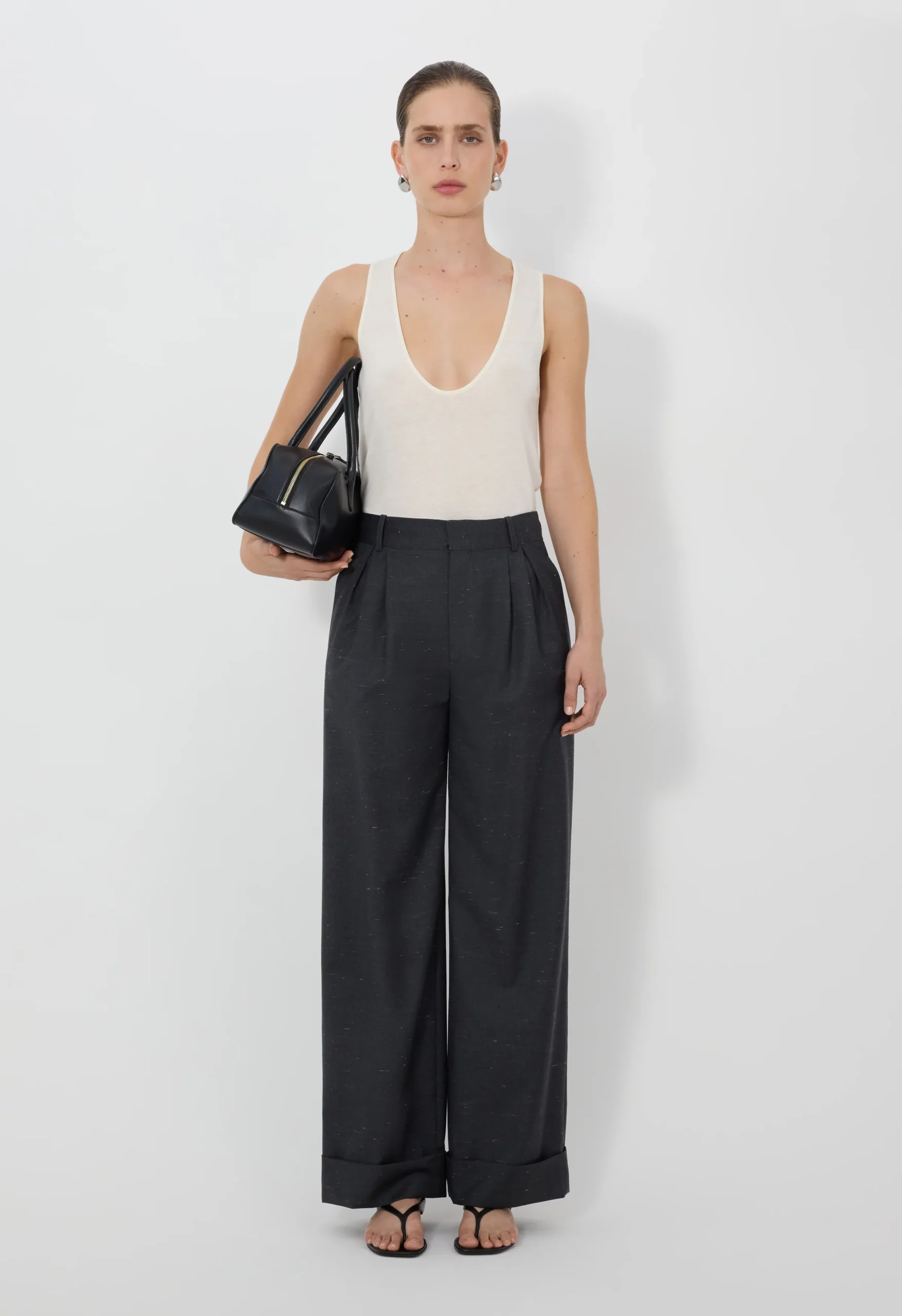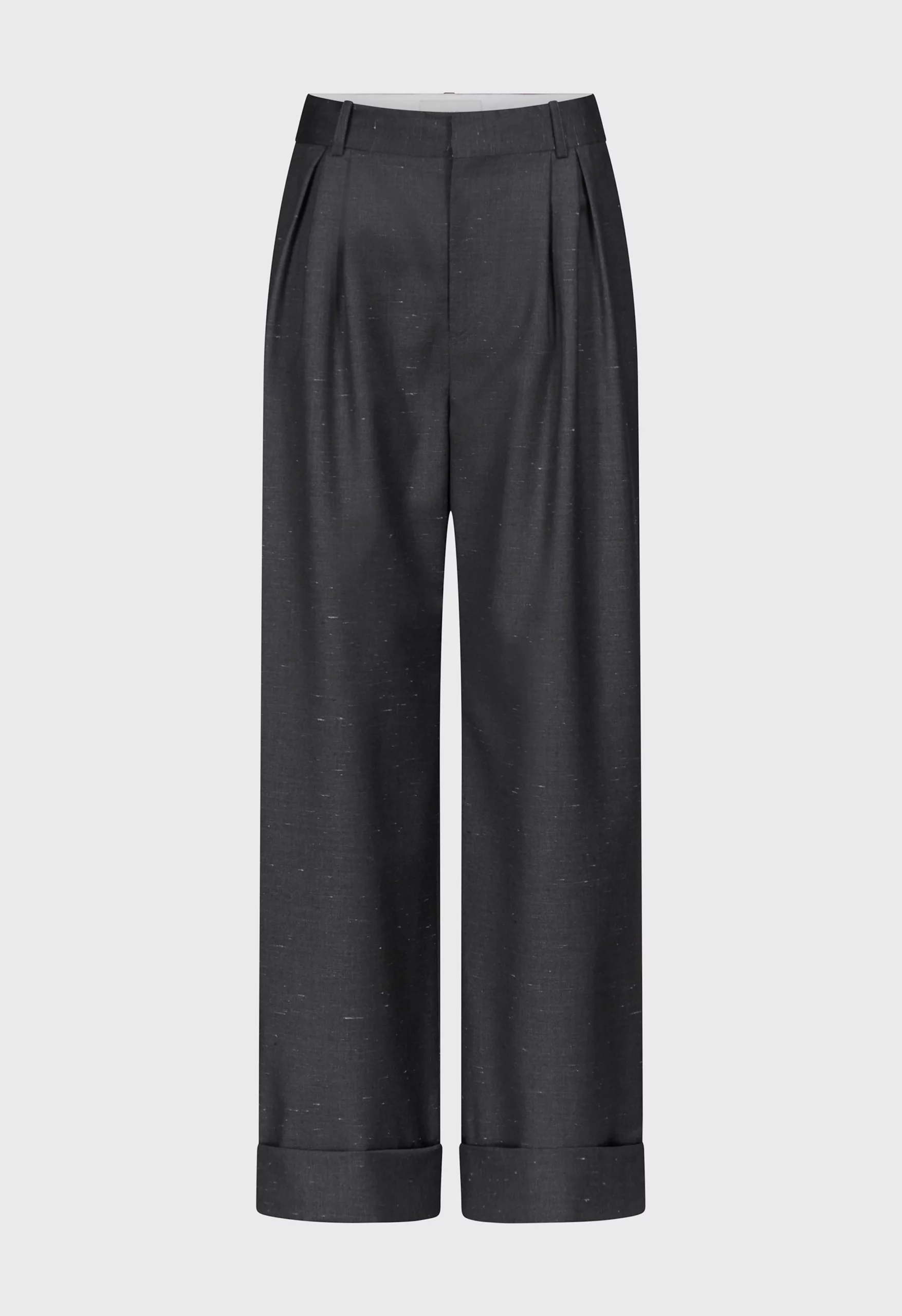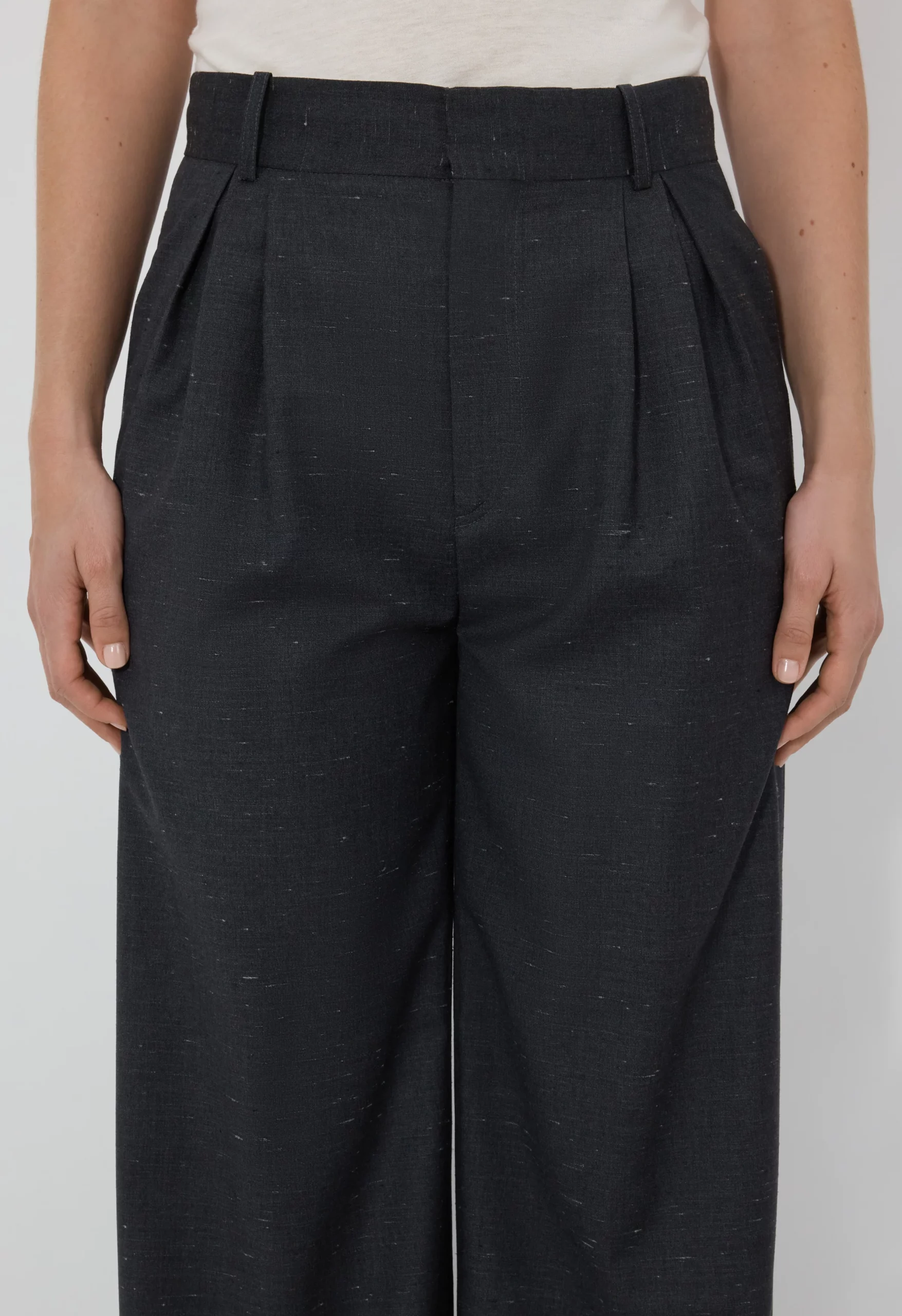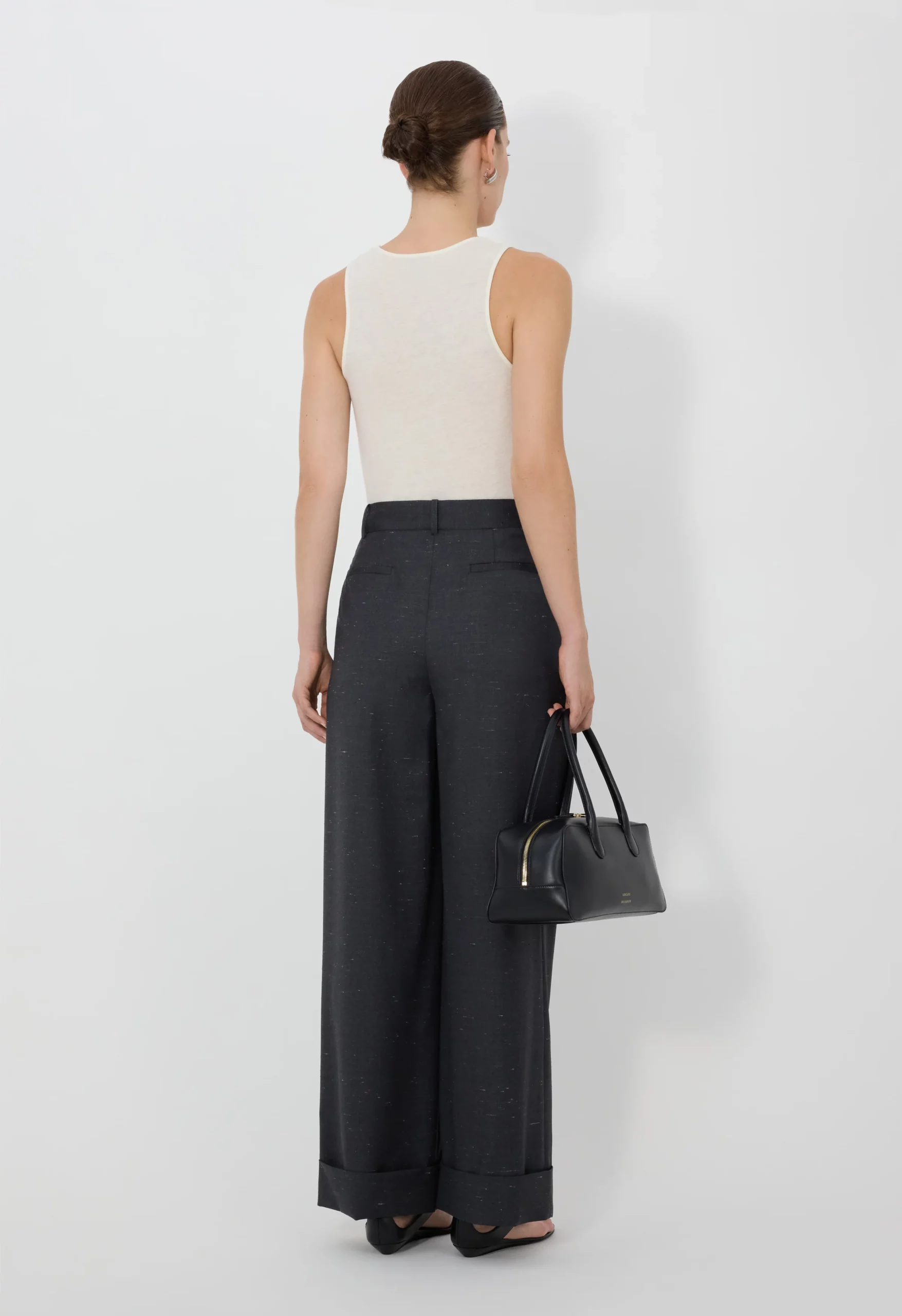 Ce pantalon noir est réalisé en laine et soie signé Loulou de Saison. Il présente une taille mi-haute et une coupe large accentuée par des plis doubles sur le devant, des ourlets retroussées avec un bouton caché, des passants pour ceinture et une fermeture glissière avec crochet.
