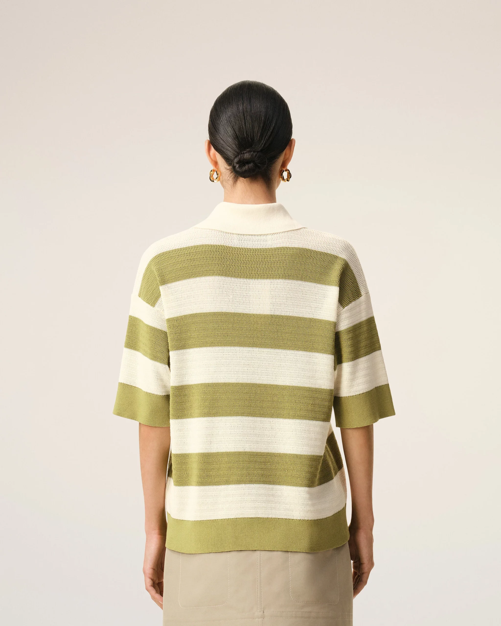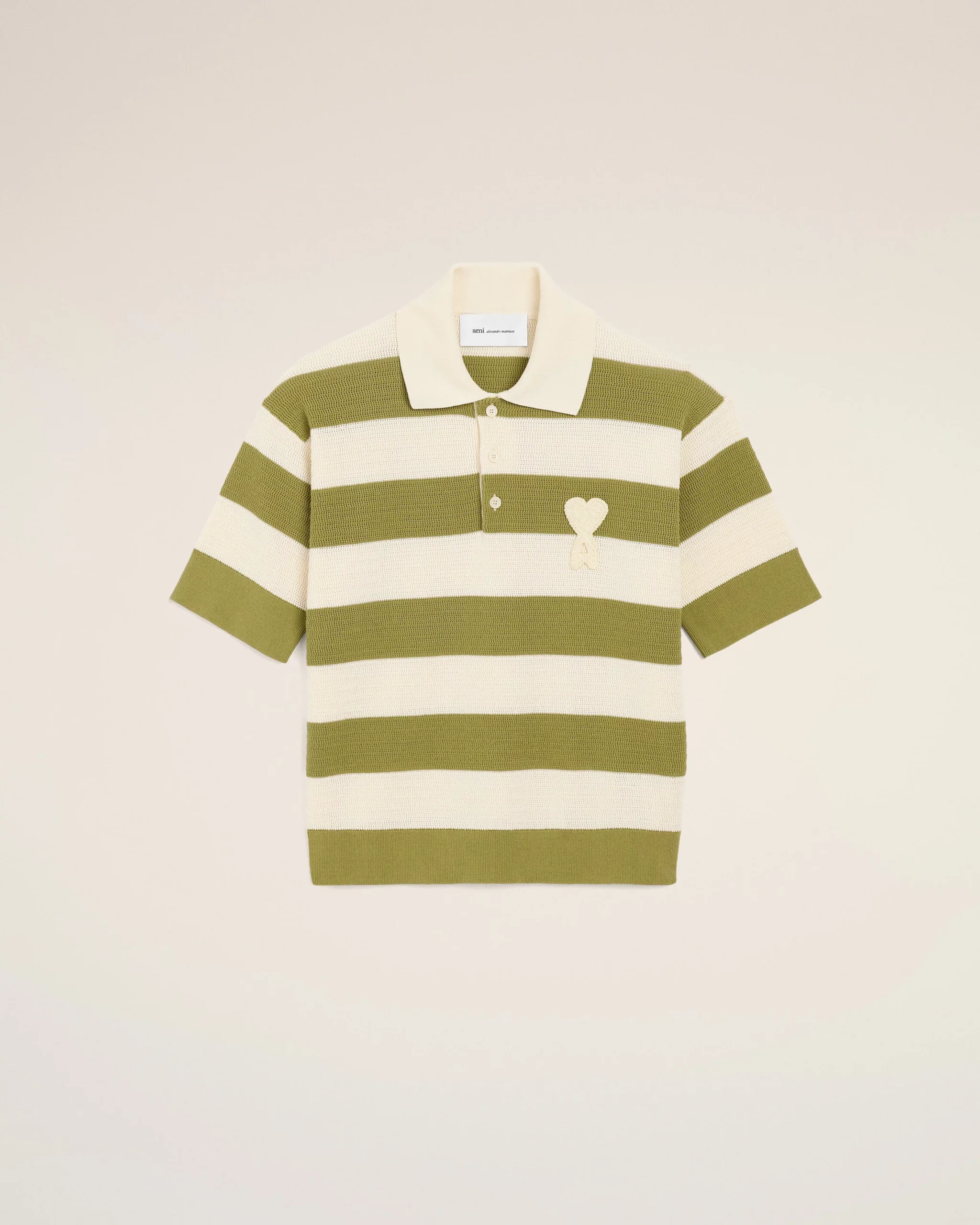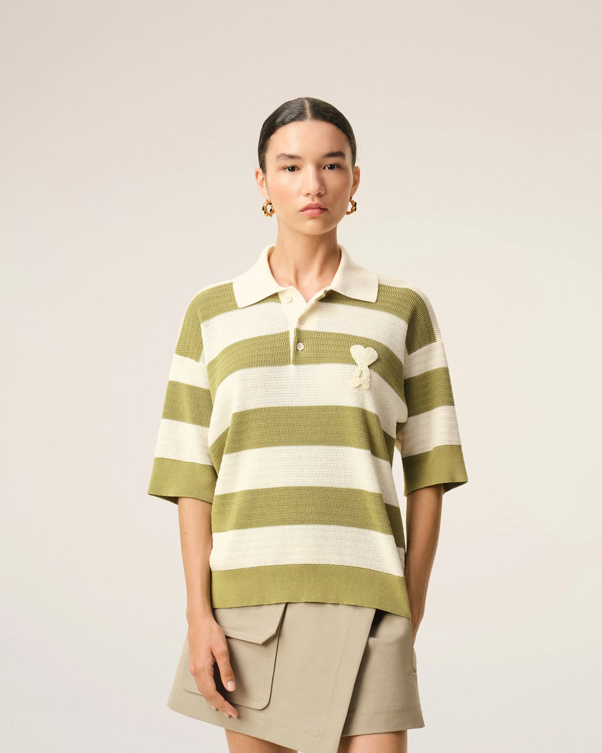 Polo manches courtes en maille coton ajourée rayée blanc et vert, signé Ami Paris.