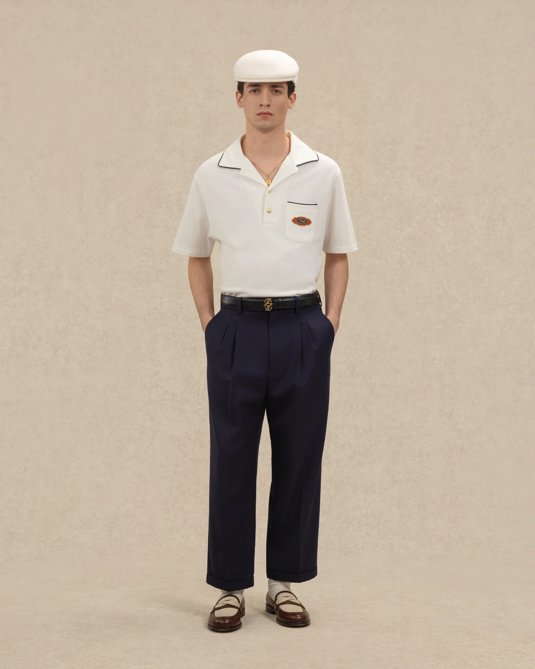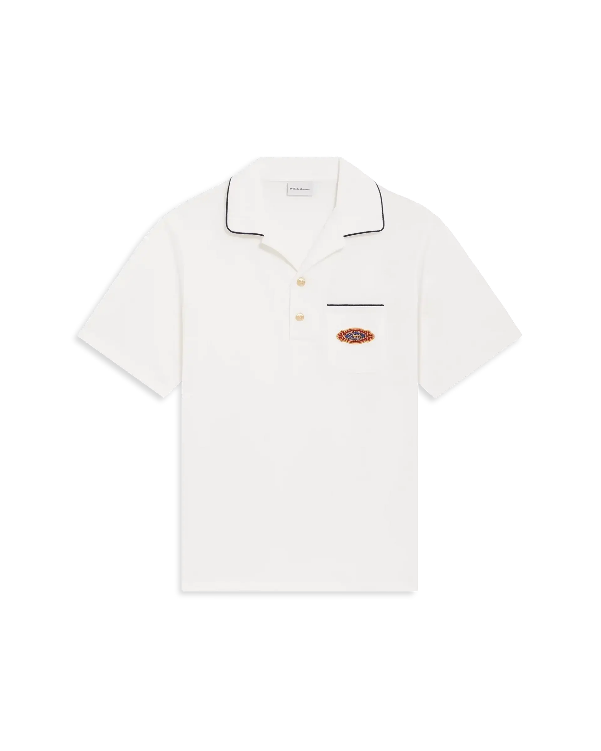 Ce polo manches courtes blanc signé Drôle de Monsieur, a un col cranté avec demi ouverture à deux boutons, une poche plaquée sur la poitrine avec une broderie « Drôle Patch » et un passepoil sur le col et la poche.
