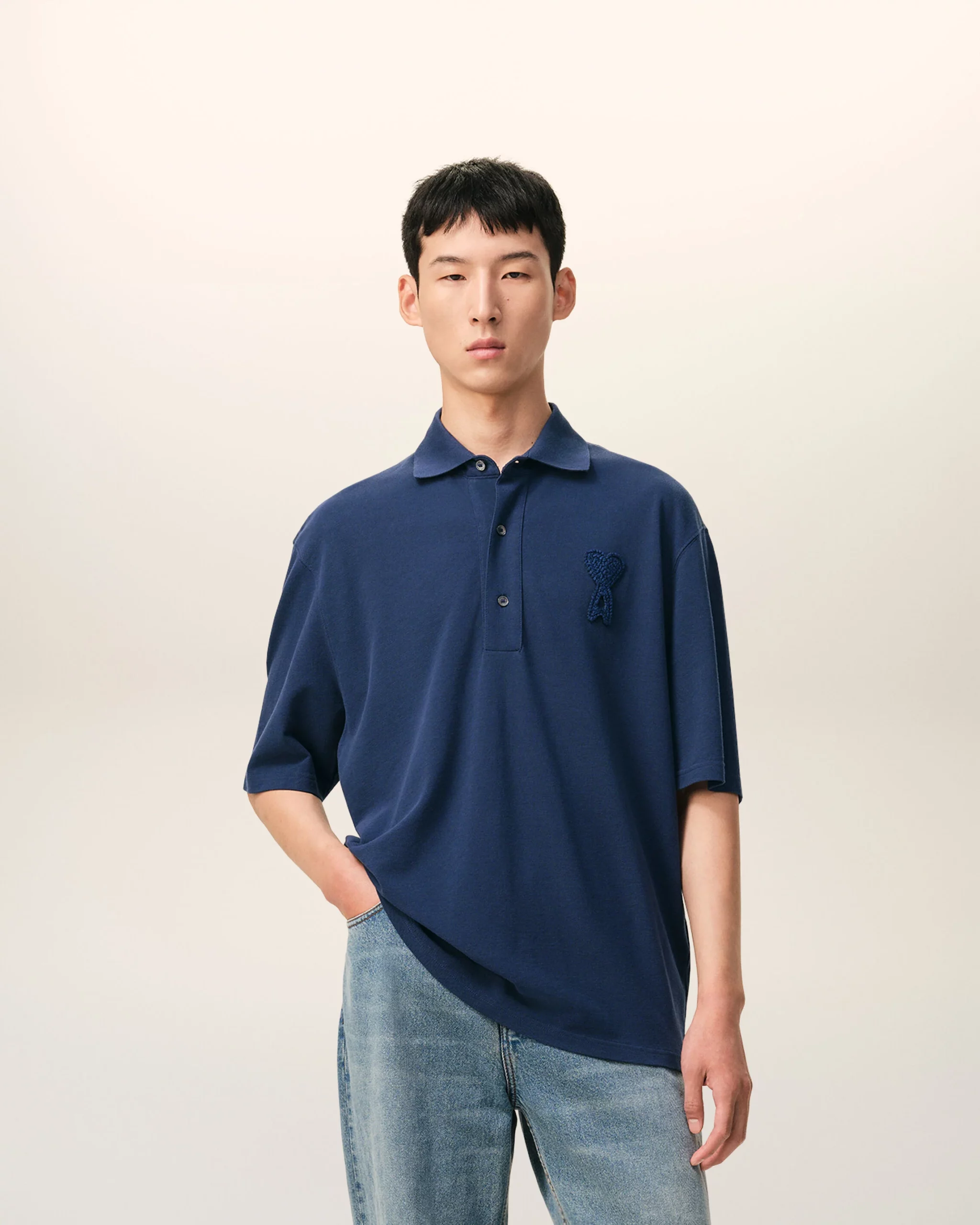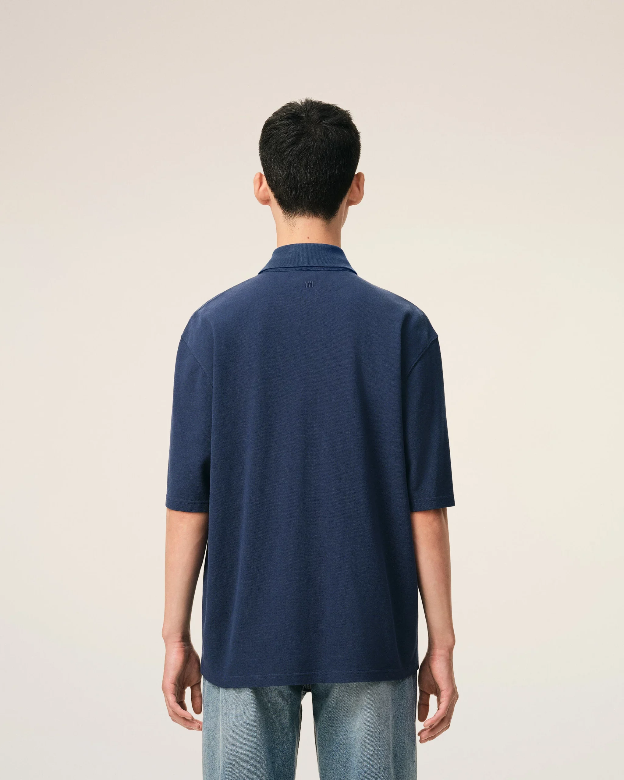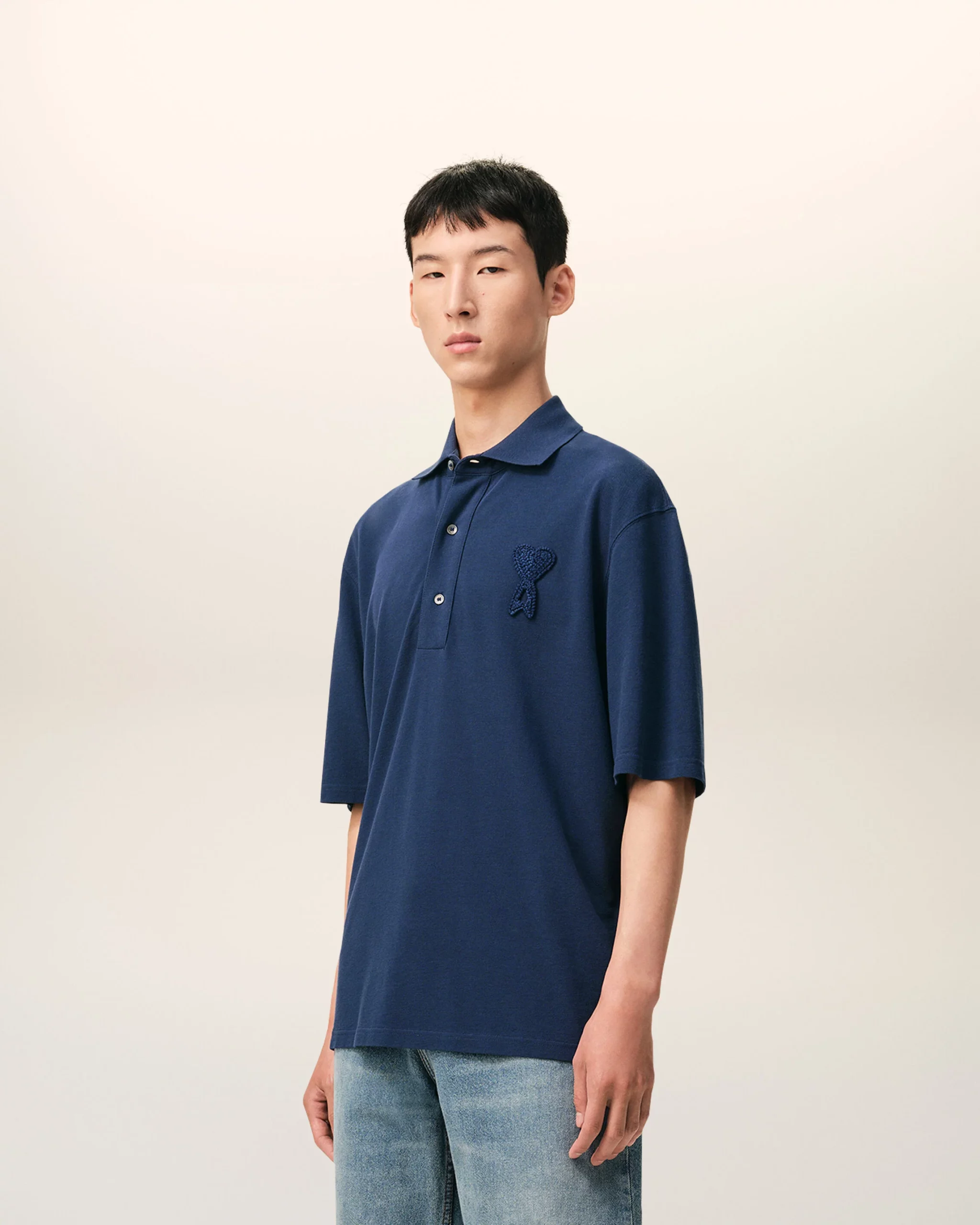 Polo manches courtes en piqué de coton bleu, signé Ami Paris.