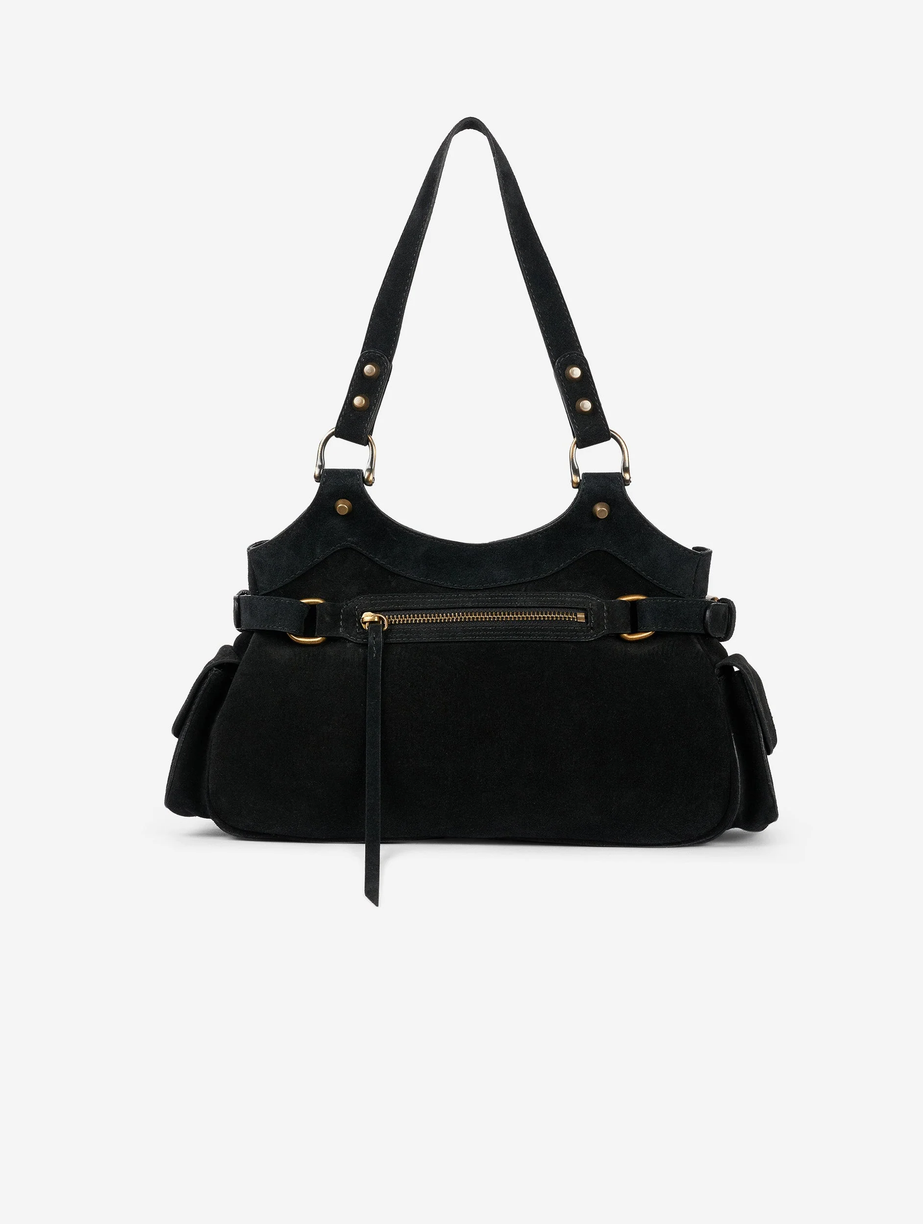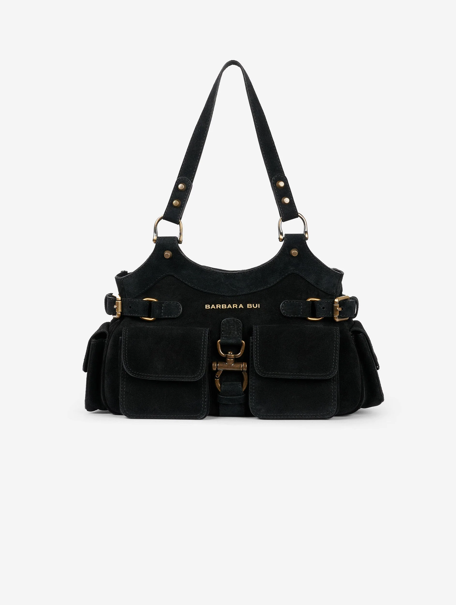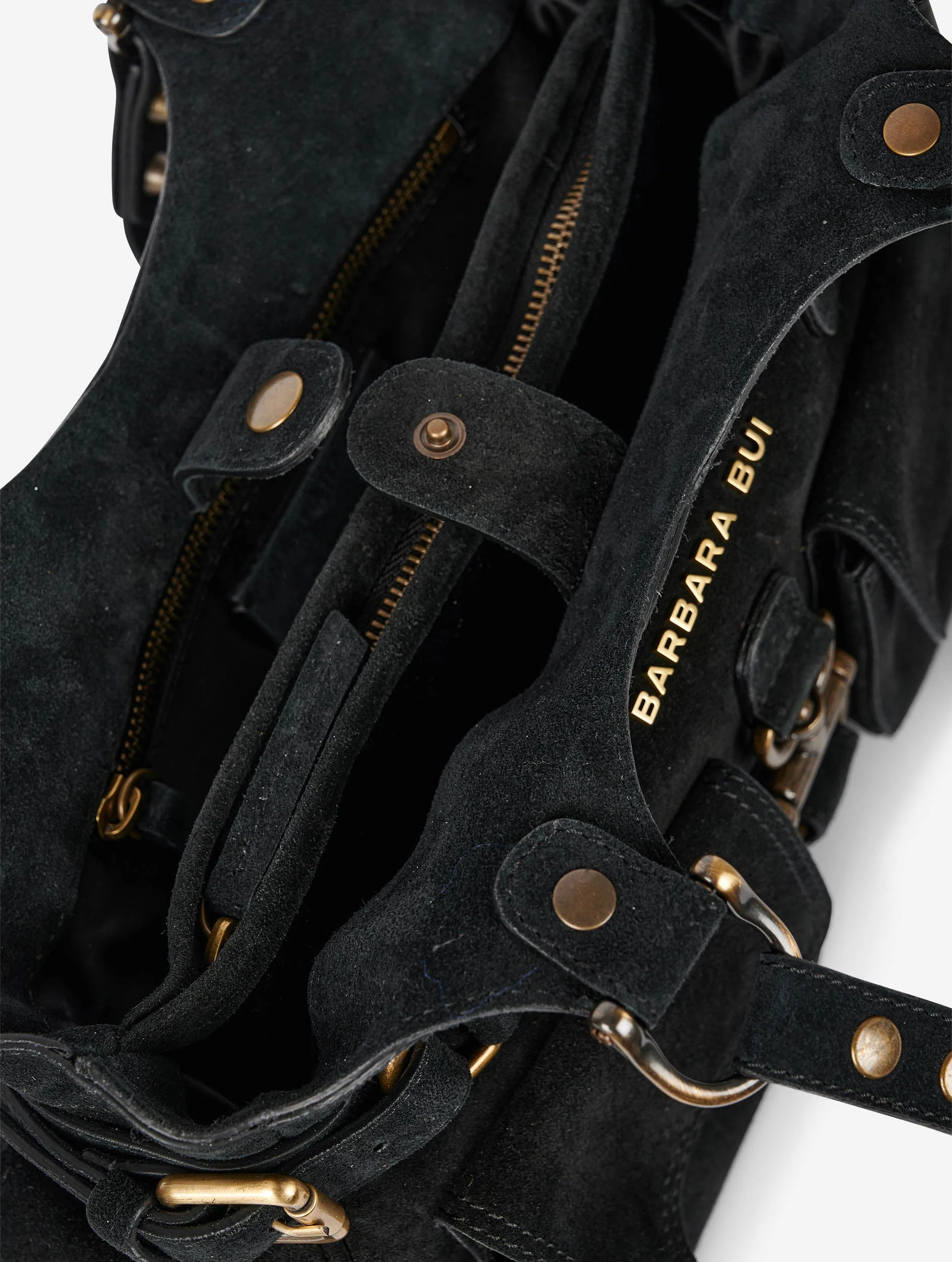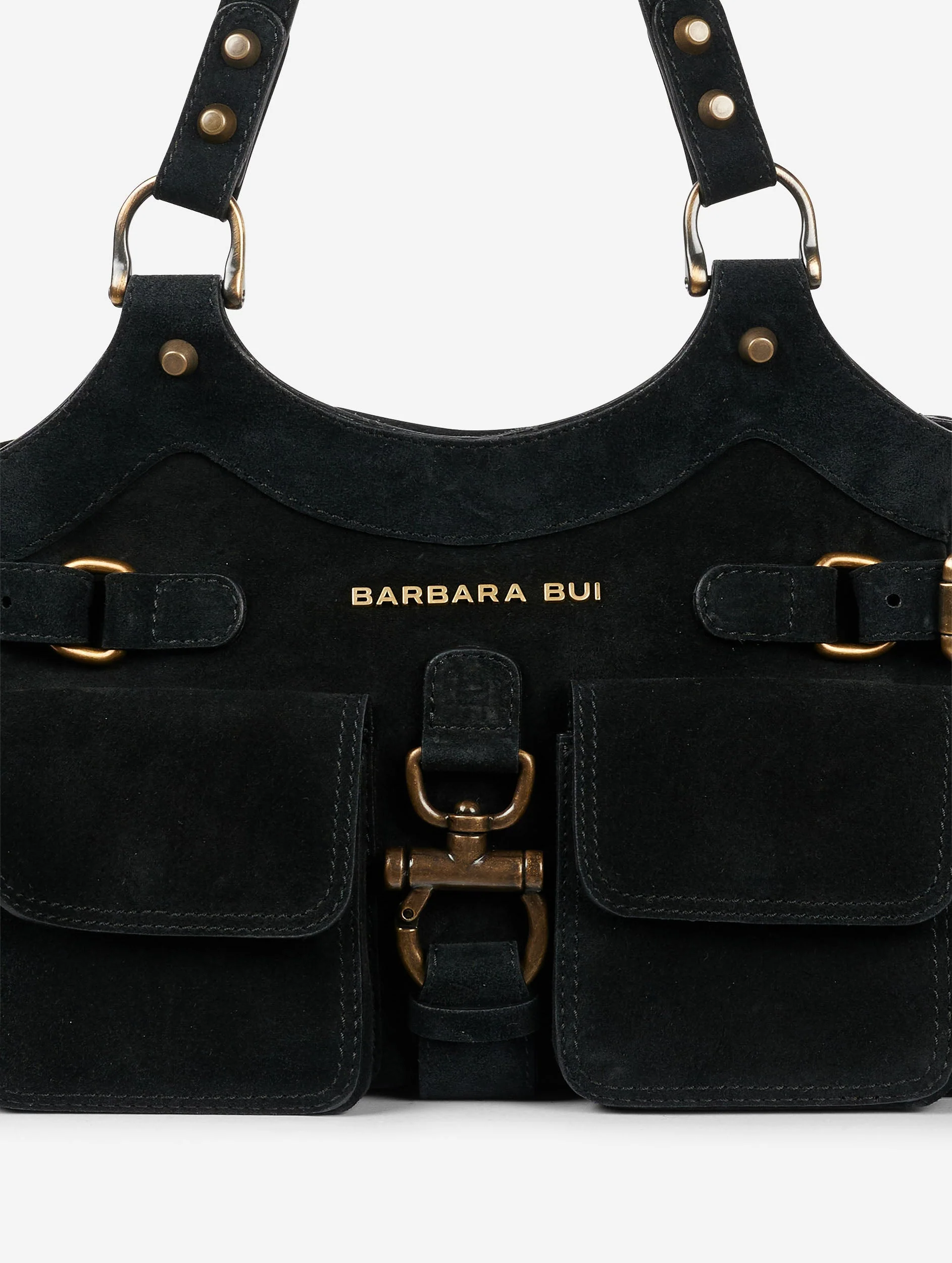 Sac multipoches « BB RE-EDITION » en veau velours noir. 4 poches à soufflet et rabat aimanté sur les extérieurs, poche dos, poche intérieure et poche centrale zippées, et 2 compartiments fermés par patte pressionnée. Longues poignées articulées pour le porter à l’épaule.