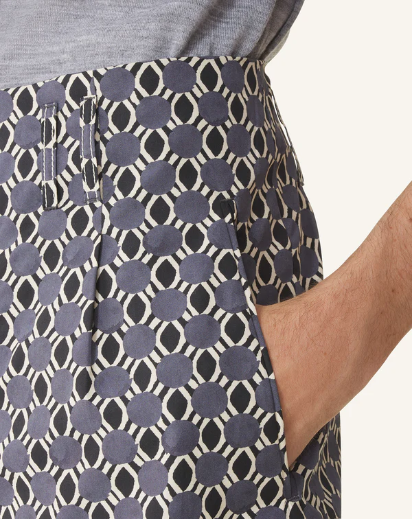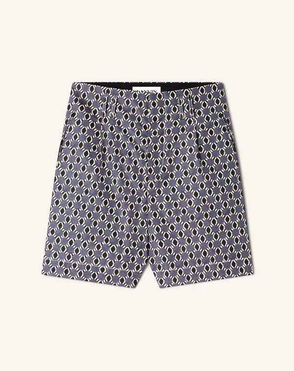L’imprimé de ce short signé Lanvin s’inspire d’une blouse portée par Jeanne Lanvin sur l’un de ses portraits, préservé dans les archives de la Maison. Sa coupe décontractée est idéale pour une tenue de jour, ses pinces structurant la silhouette avec élégance. Il se porte avec la chemise assortie ou avec un t-shirt.