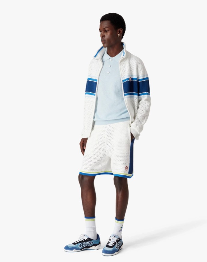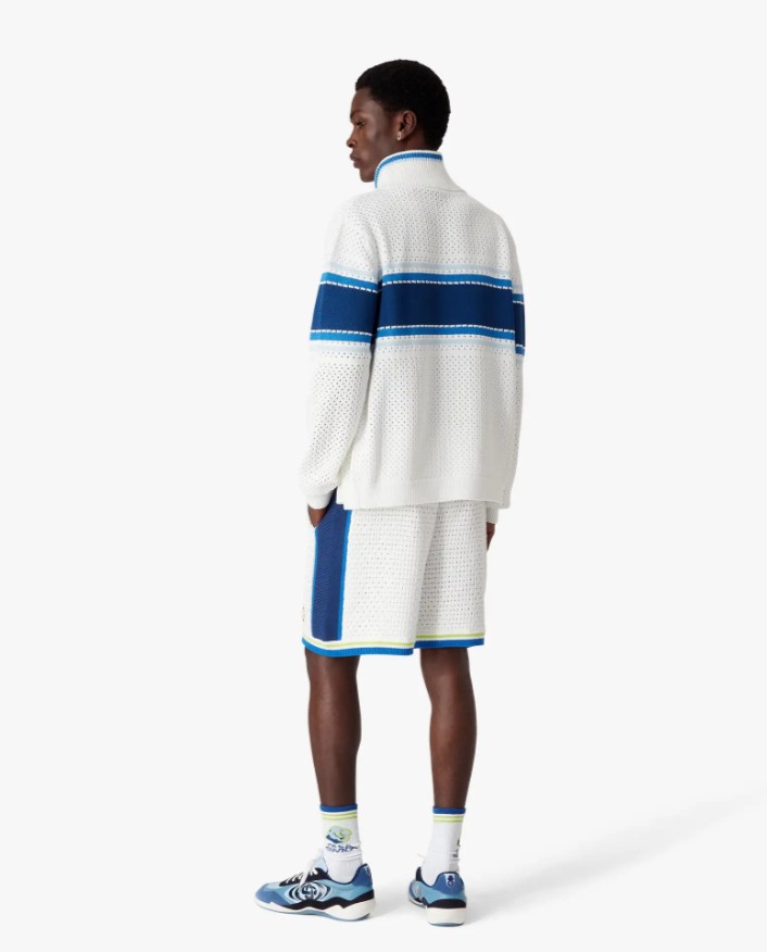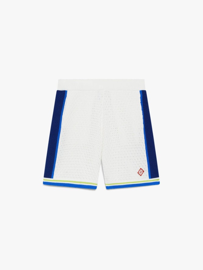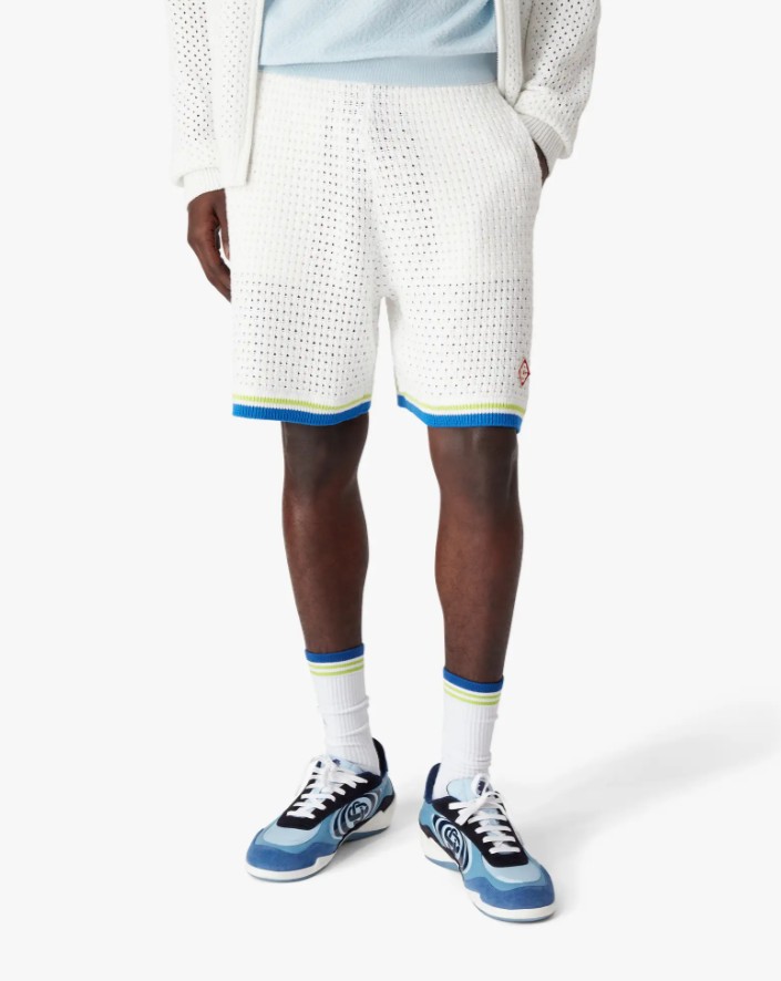 Le short blanc et bleu en crochet signé Casablanca est un modèle raffiné, confectionné dans une maille ajourée et rehaussé de rayures sur les côtés. Il est doté d’une ceinture élastique, d’un cordon de serrage, de poches latérales dissimulées et d’un détail à rayure sur les jambes.