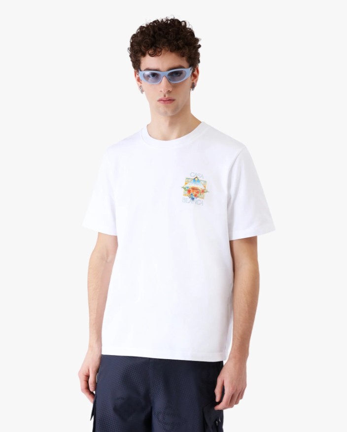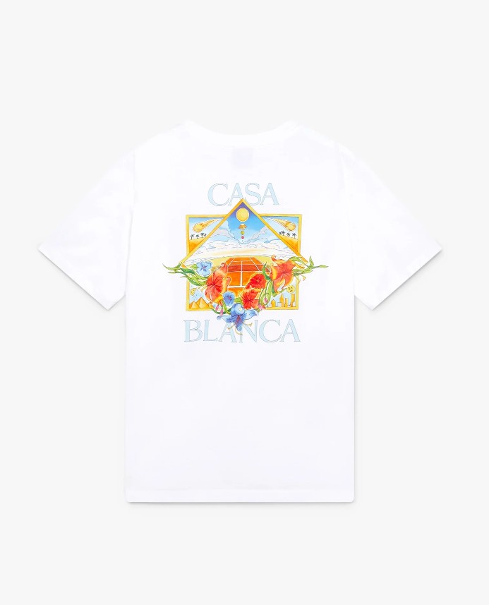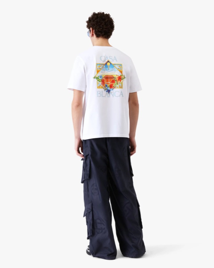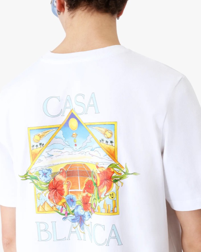 Le tee-shirt à manches courtes blanc Flower Court Icon signé Casablanca est un modèle raffiné, orné d’une illustration où des cadres entrelacés créent des niches de scènes différentes qui évoquent la transcendance du temps et du lieu à travers le regard du sport. Il est agrémenté d’un col rond classique et d’une coupe décontractée.