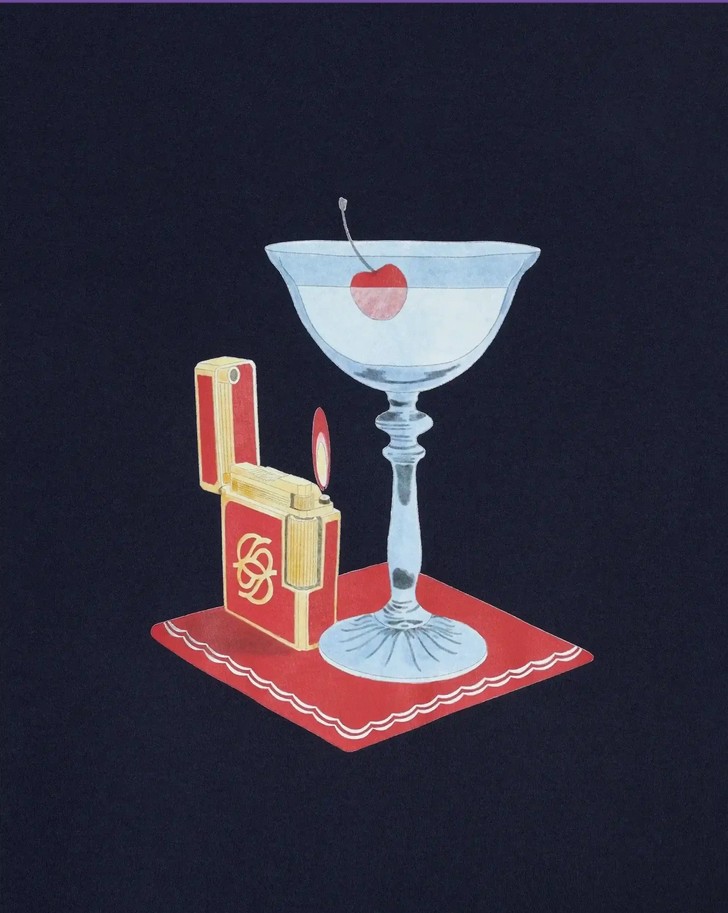 Ce tee-shirt Drôle de Monsieur bleu marine 100% coton interlock à encolure en bord-côte est illustré de l’imprimé Cocktail à l’avant.