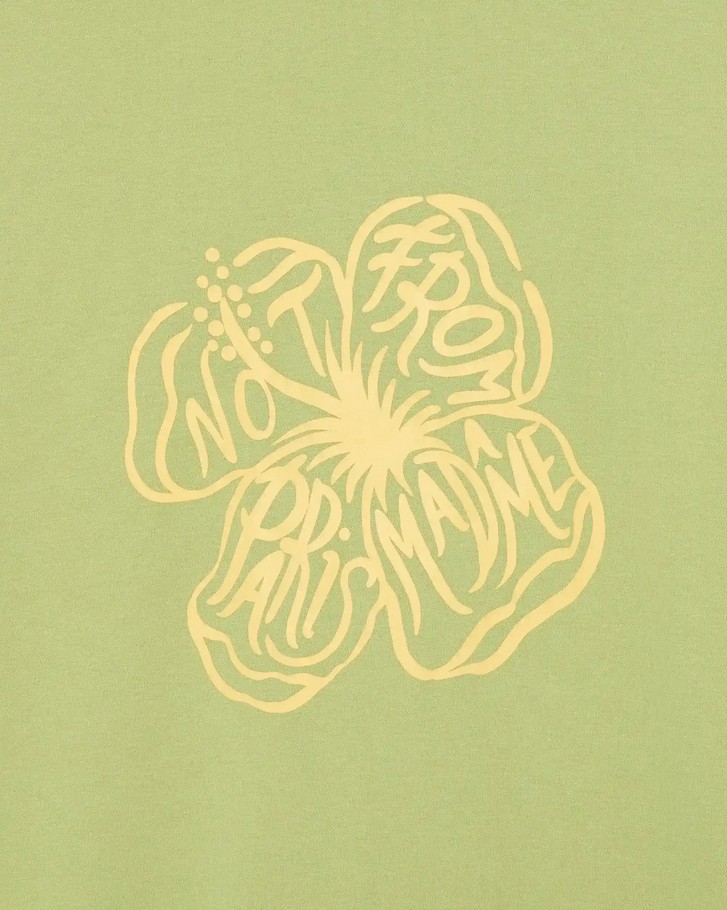 Ce tee-shirt Drôle de Monsieur vert olive 100% coton interlock à encolure en bord-côte est imprimé d’un Hibiscus à l’avant.