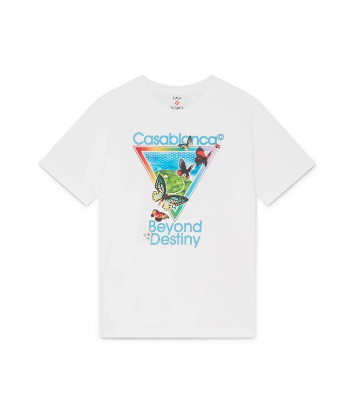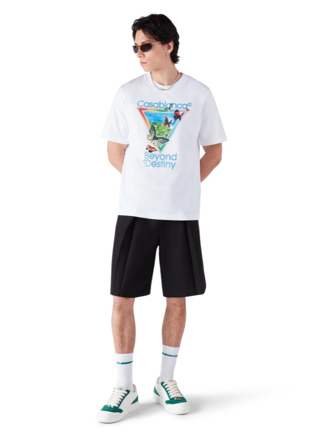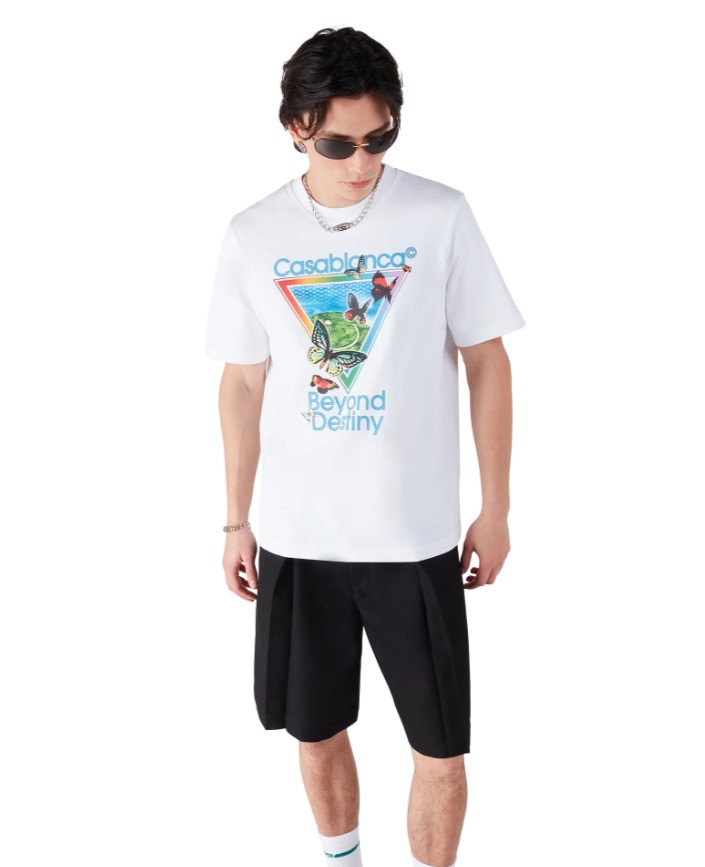Le tee-shirt à manches courtes « Tennis Club Icon Beyond Destiny » est un modèle raffiné qui revisite notre version de la chemise en soie souvenir classique Casablanca, réinventée à travers le prisme de l’art numérique. Les éléments numériques rencontrent l’organique, avec des papillons peints à la main et des paysages insulaires oniriques. Il est agrémenté d’un col ras du cou côtelé classique.